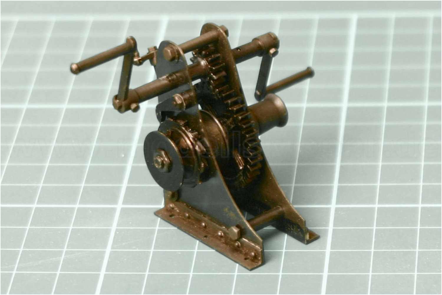 Die Ankerwinde hat noch ein paar Sockelprofile erhalten. Kleine Messingstifte imitieren die Nietverbindung. Die Winde wurde brüniert und ist nun fertig.