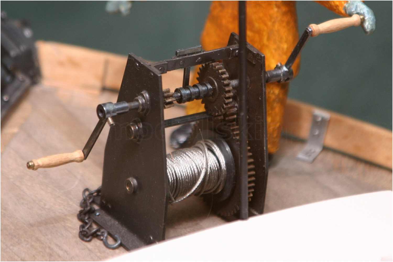 Blick auf die Spillkopfseite: Zahnrad und Ritzel sind aus Kunststoff, mit schwarzem Permanentmarker ''lackiert'' und stammen aus der Restekiste. In das große Zahnrad sind Speichen eingefräst (sieht man oben auf dem einen Bild noch genauer), links neben dem Zahnrad, die Trommel der Bandbremse.