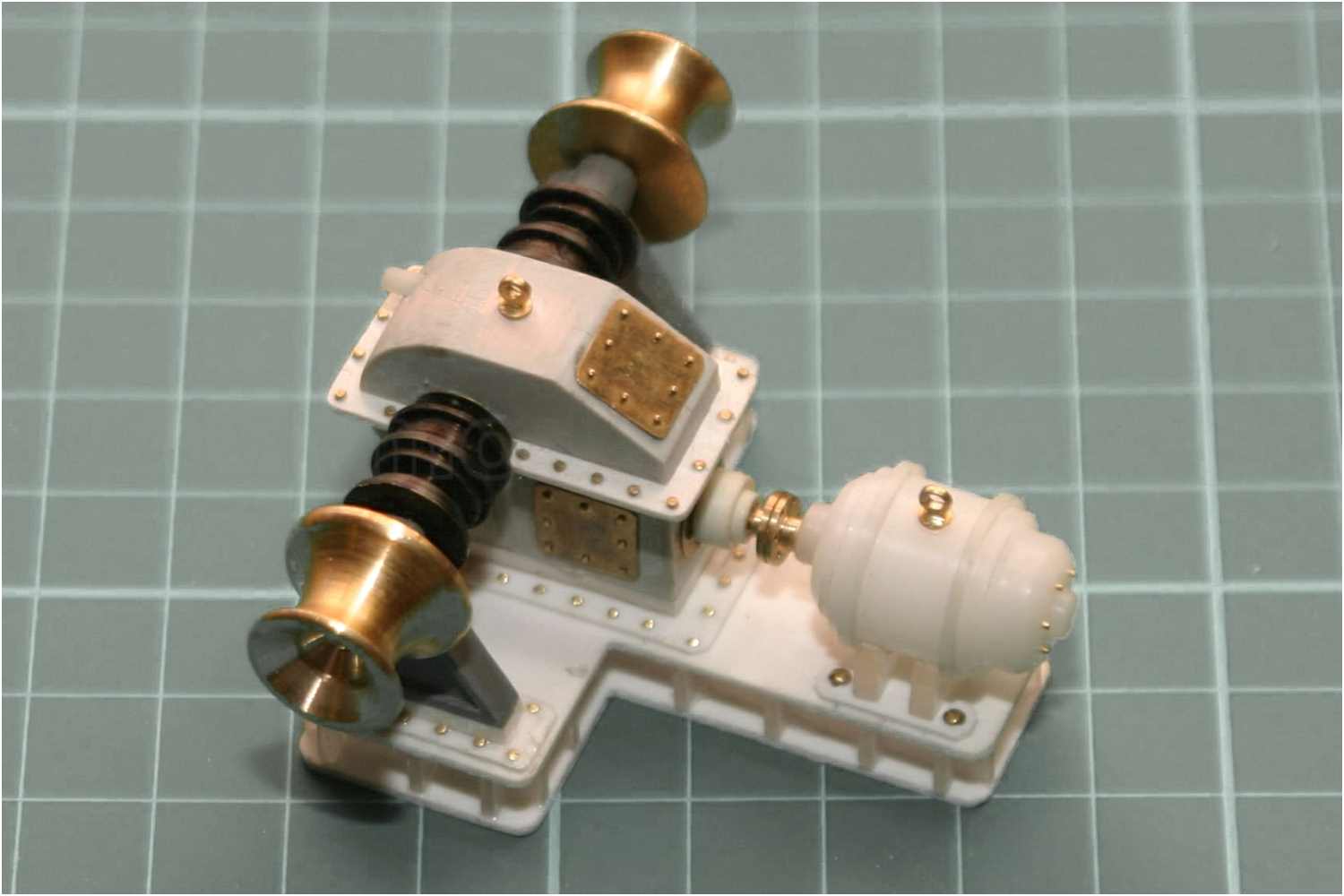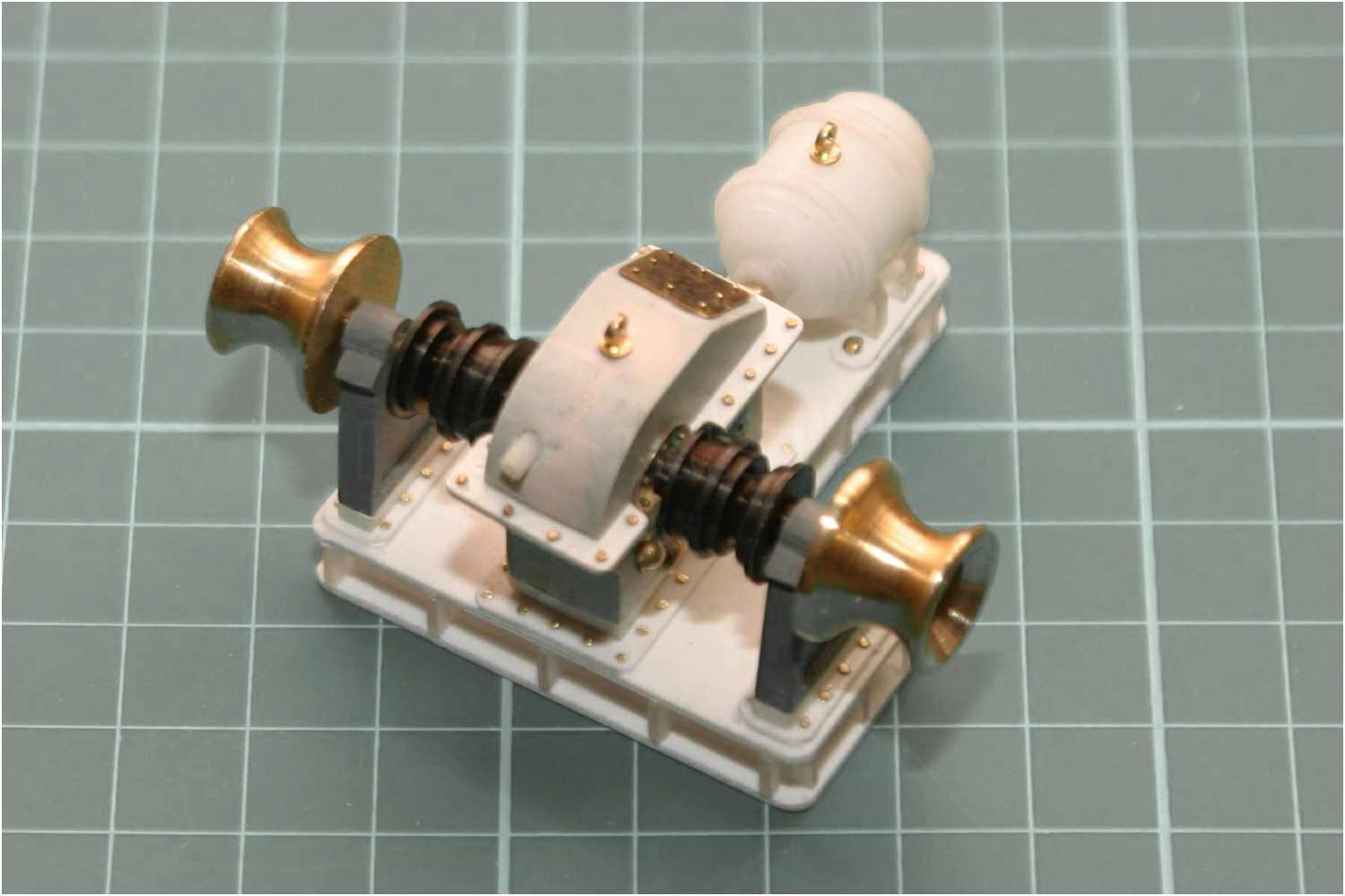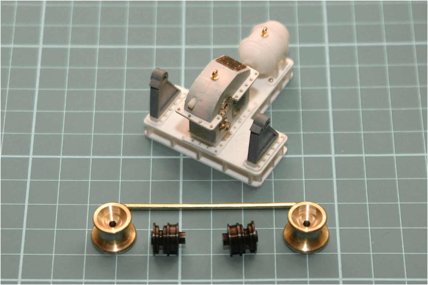 Die Verschraubungen der Sockelplatten sind mit Messingstiften imitiert, das Getriebegehäuse, die Wellenböcke und der Motor aufgeklebt.