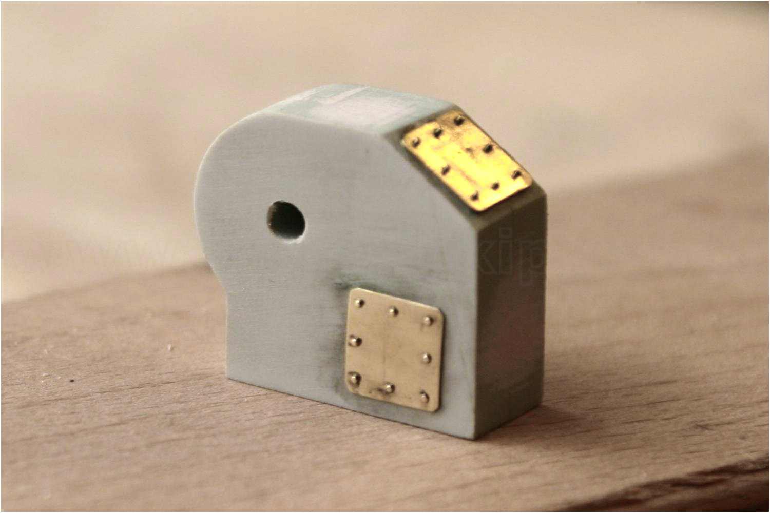 Aus einem Kunststoffblock wurde das Getriebegehäuse gefräst, Serviceluken aus dünnem Messingblech mit Schraubenimitationen und die Süllkante des Gehäusedeckels mit Schraubenimitationen ist fertig.