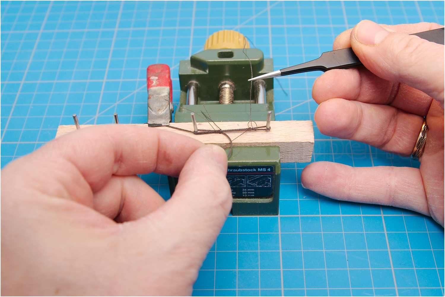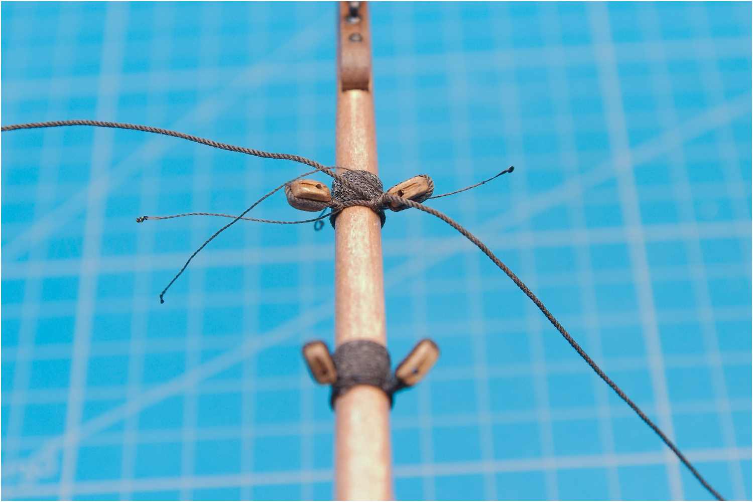Dazu lege ich das Tau auf einer Nagelbank um die Nägel, dass ich links und rechts je eine Schlaufe für die Blöcke erhalte und binde zwei Taklinge so, dass sich mittig ein Auge bildet, durch das das Spriet gesteckt werden kann.