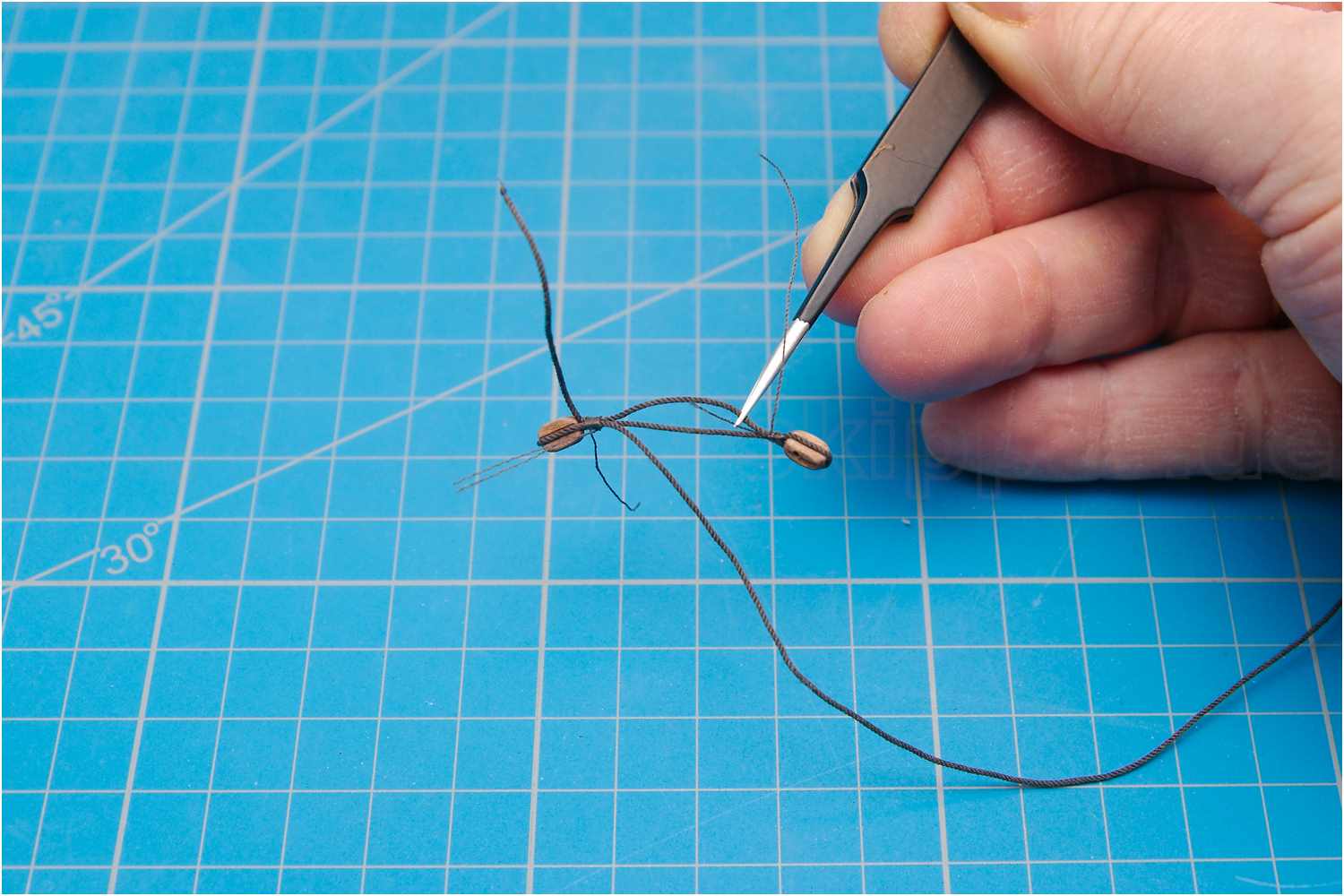 Die Blöcke werden abschließend noch in die Laufrichtung des späteren Taus gedreht, mit Sekundenkleber fixiert und die überschüssigen Enden mit einer scharfen Klinge bündig abgeschnitten.