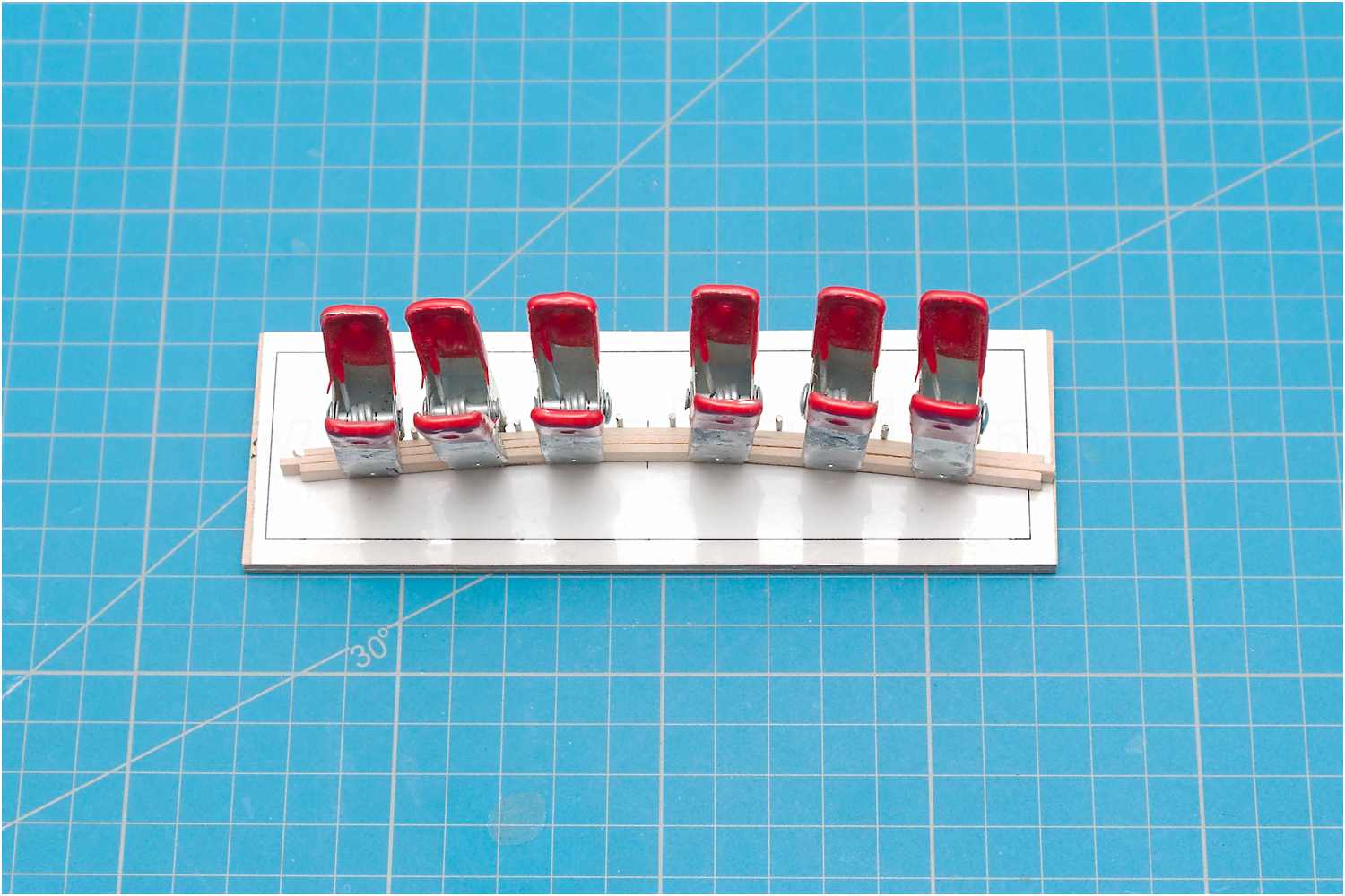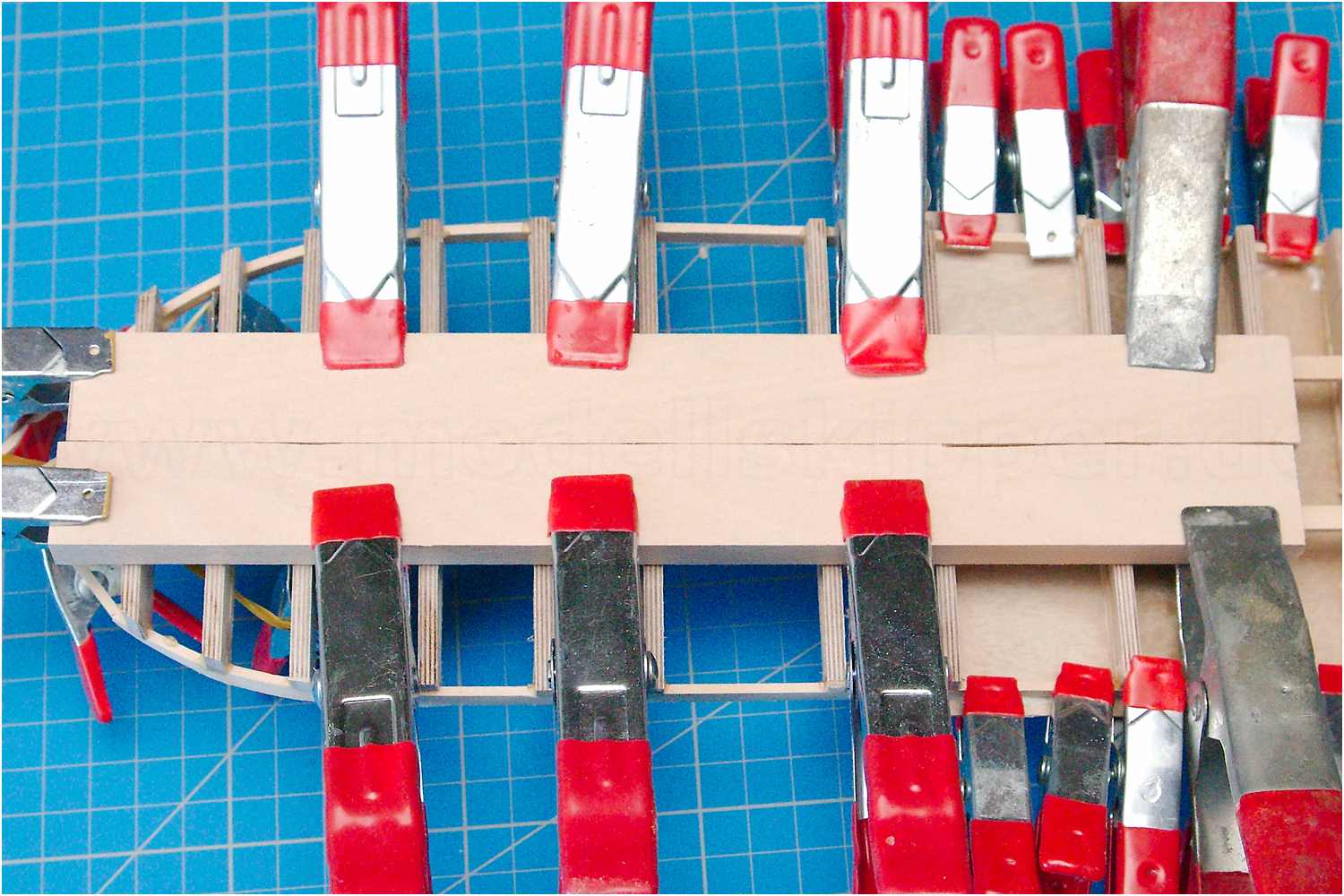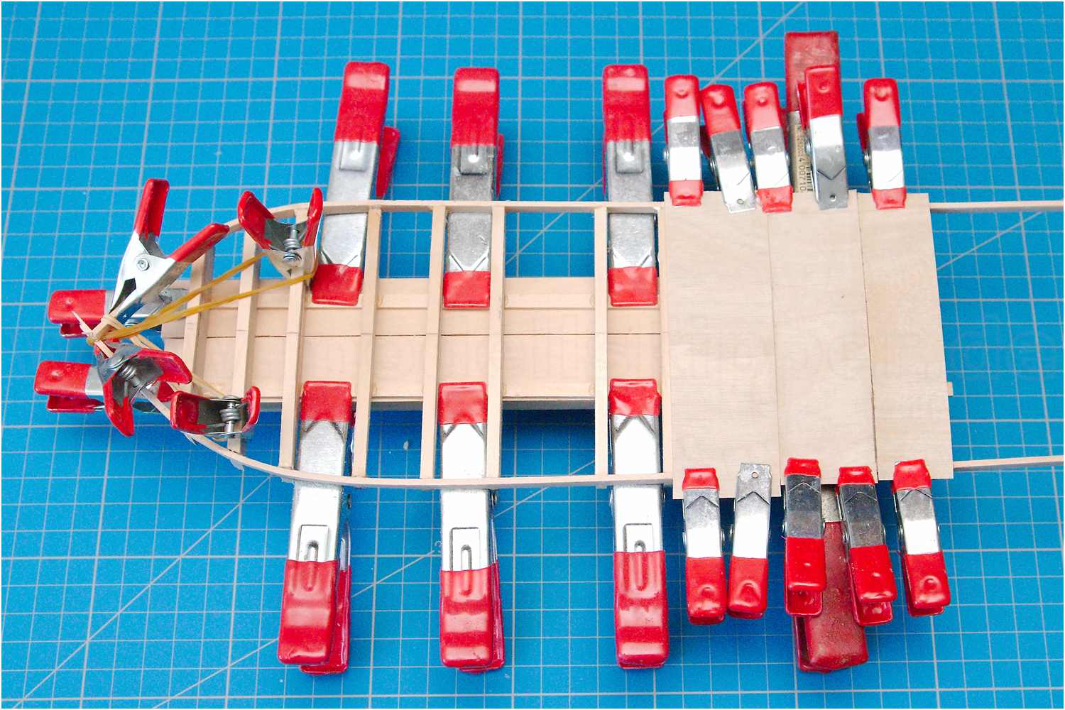 Man klebt die einzelnen Streifen über die Balkenabstände, und um dabei das Verziehen der Unterdeckskonstruktion zu vermeiden, fixiert man alles auf einer starke Holzleiste auf der Unterseite mit Klammern an den Stringern.