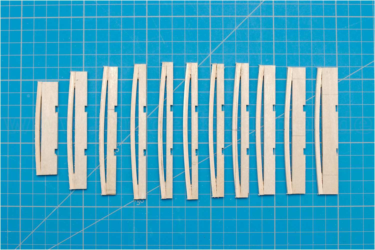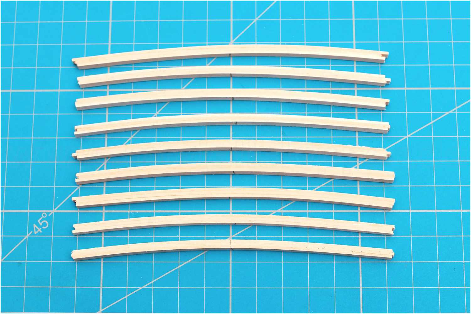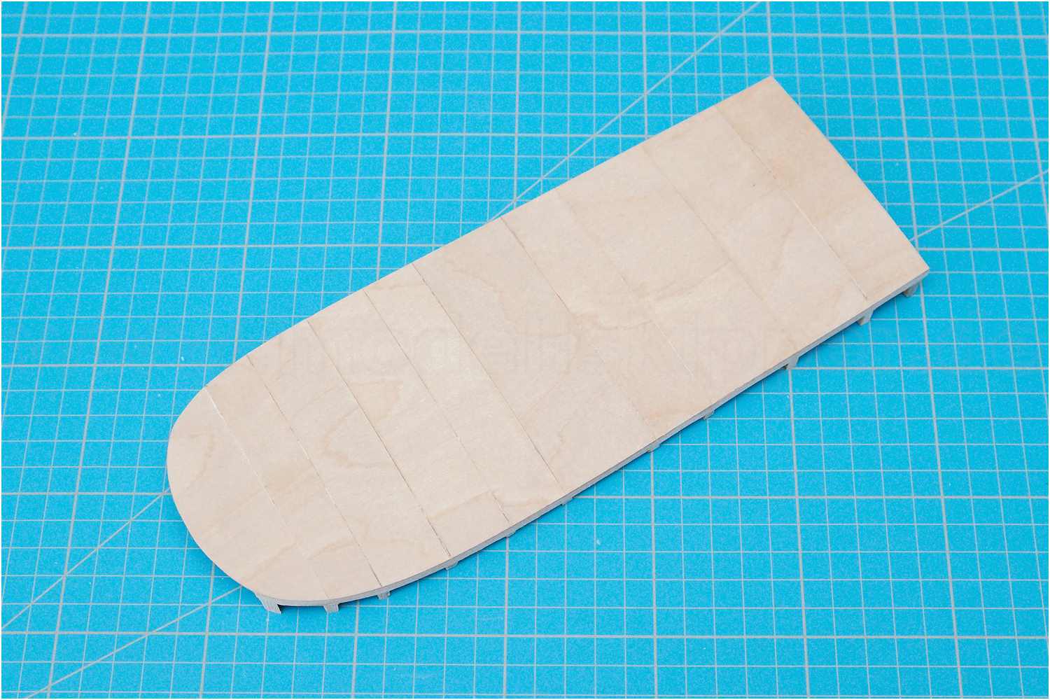 Da sich das Sperrholz nur in einer Ebene biegen lässt, schneidet man die Streifen so zu, dass sie quer mit der Balkenbucht gebogen werden können, in der Breite von der Mitte eines Decksbalken zur Mitte des nächsten.