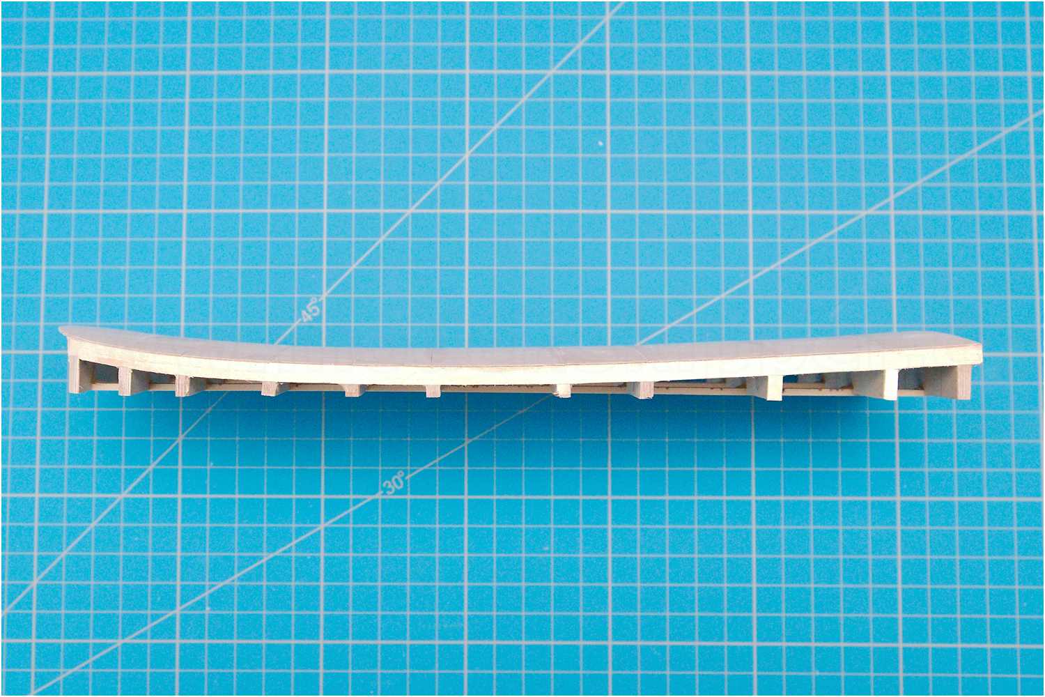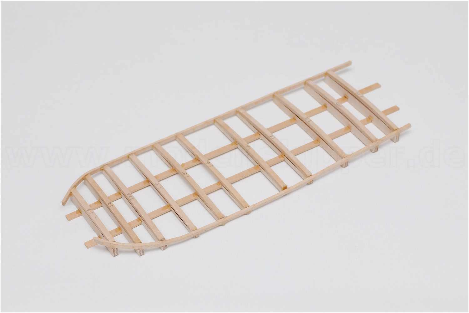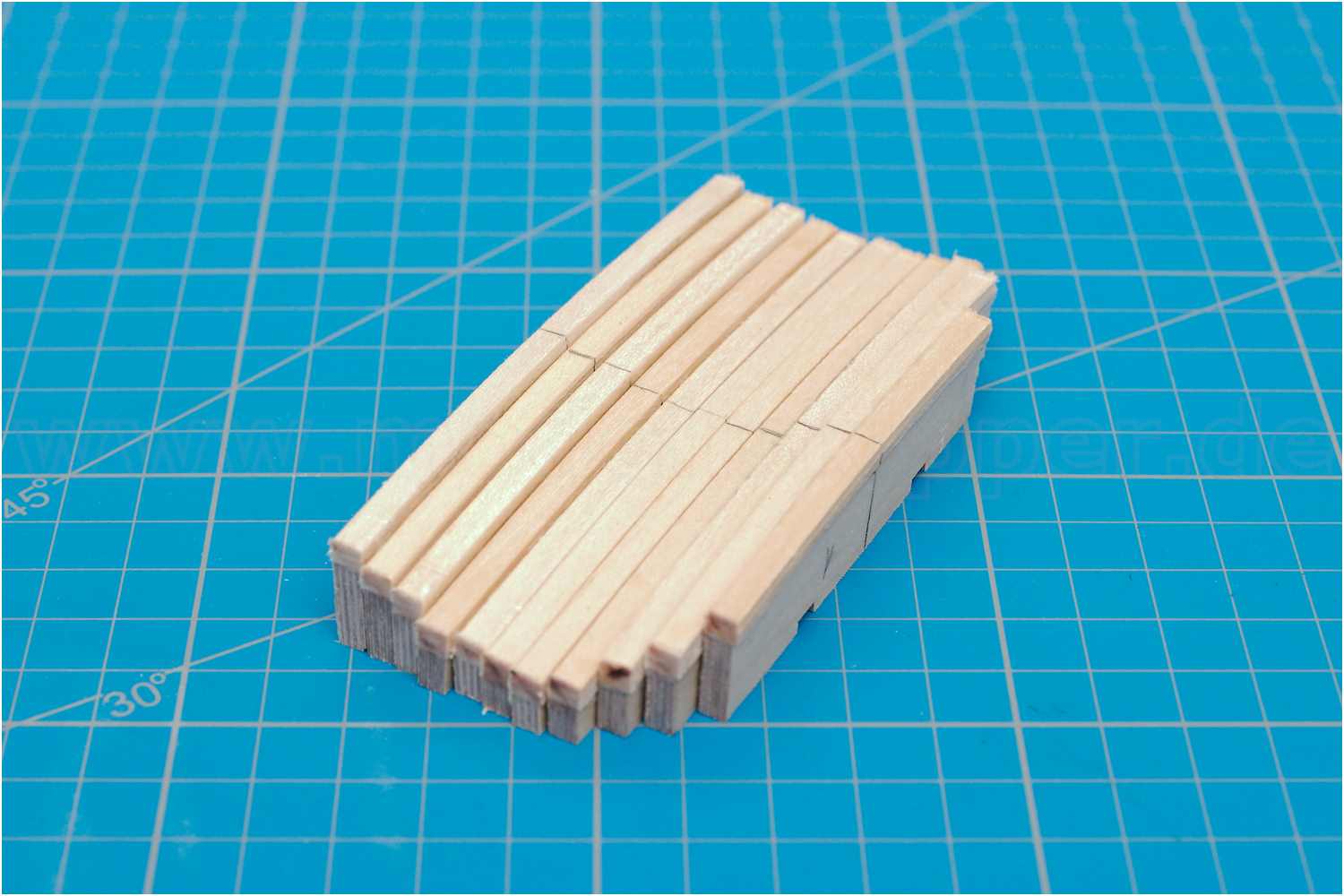 Dazu werden unter die Decksbalken Abstandshölzer geklebt, in die man vorher zwei Nuten für Stringer eingearbeitet hat. Die Höhe der Abstände entnimmt man dem Bauplan.