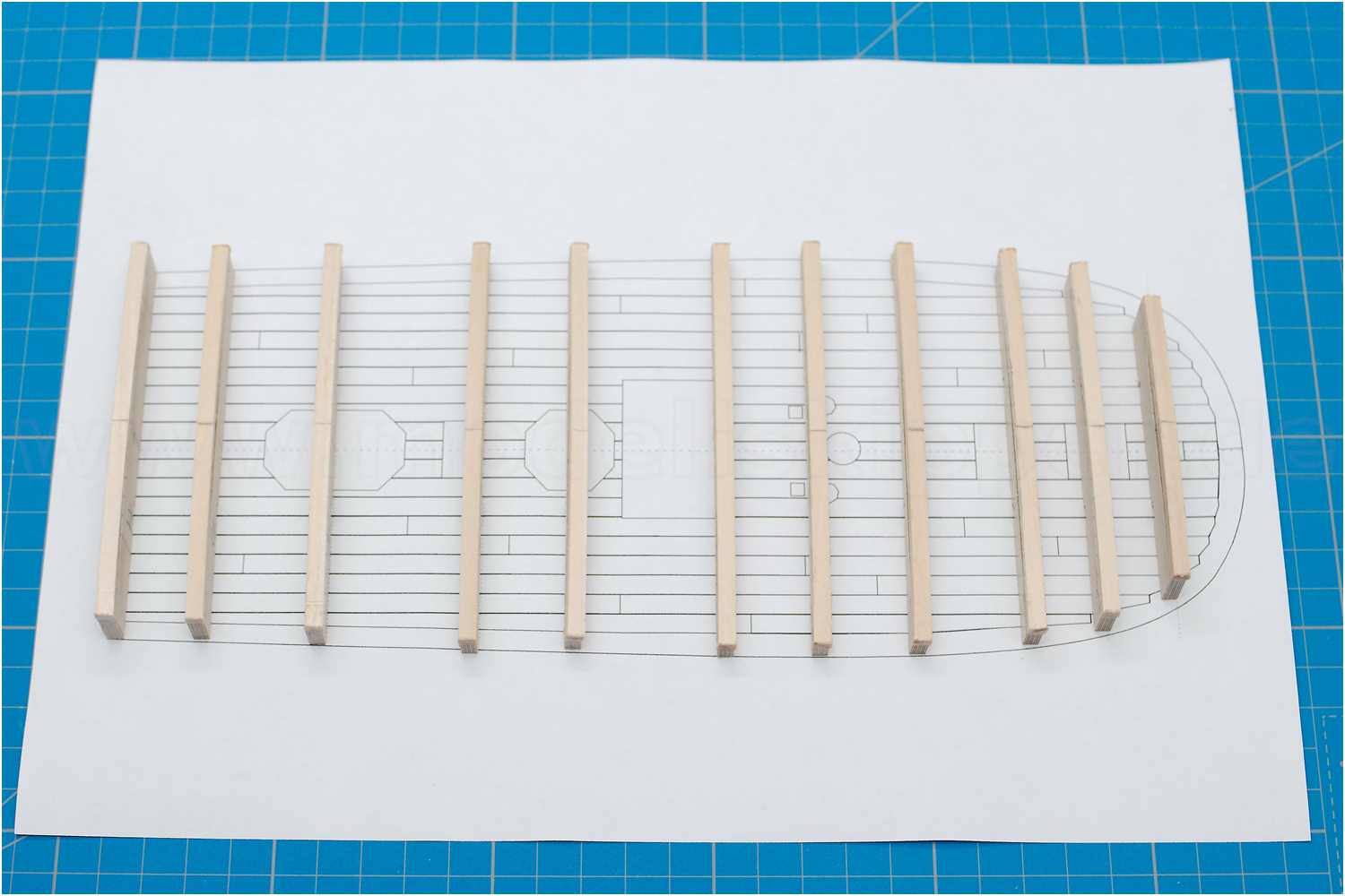 Auf dem Planausdruck von der Draufsicht des Decks werden die Balkenhölzer angepasst und ausgerichtet, im vorderen Bereich gestrakt, auf die Stringer geklebt und noch einmal seitlich mit Leisten stabilisiert.
