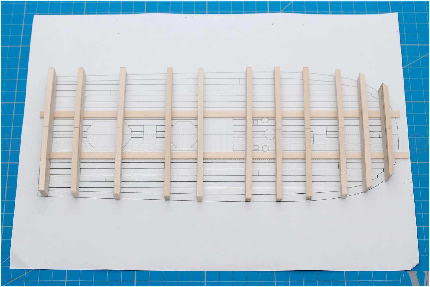Im Fall, dass ein Deck außerhalb des Rumpfes angefertigt wird, wie beim Projekt der Statenjacht Fredericus, fertig man sich zuerst eine Unterdeckskonstruktion an.