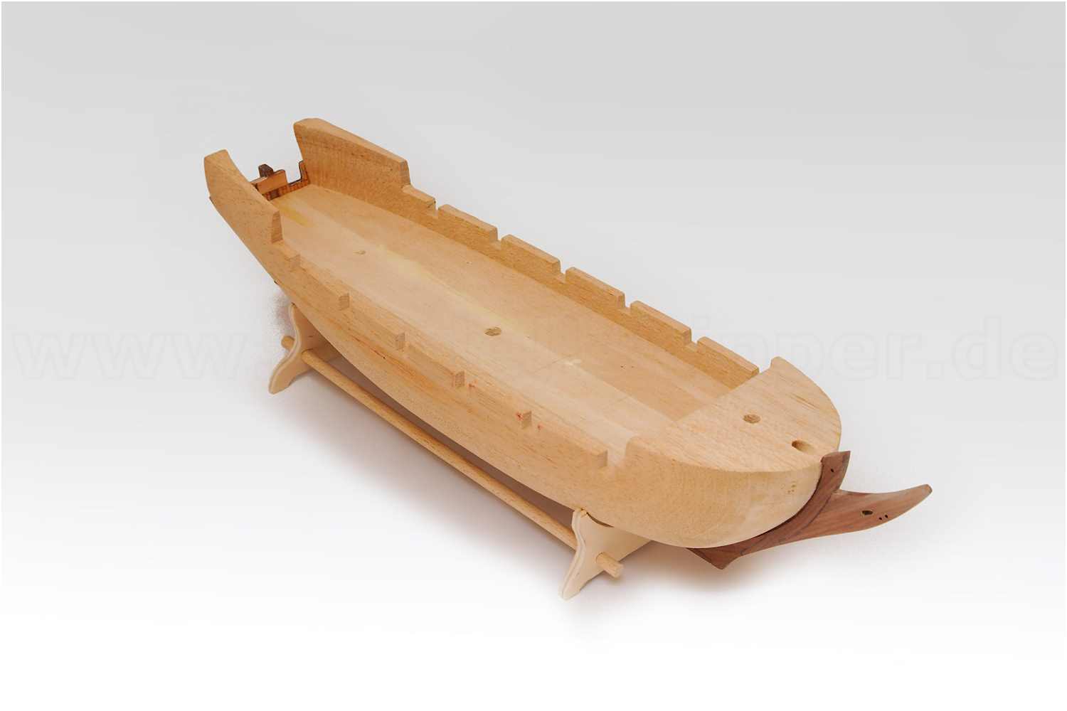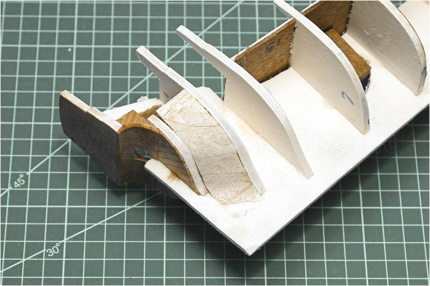 Oftmals werden nur Bereiche am Bug und Heck mit Holzklötzen aufgefüllt und dann die erste Beplankung mit Leisten direkt auf die Mallen aufgebracht.