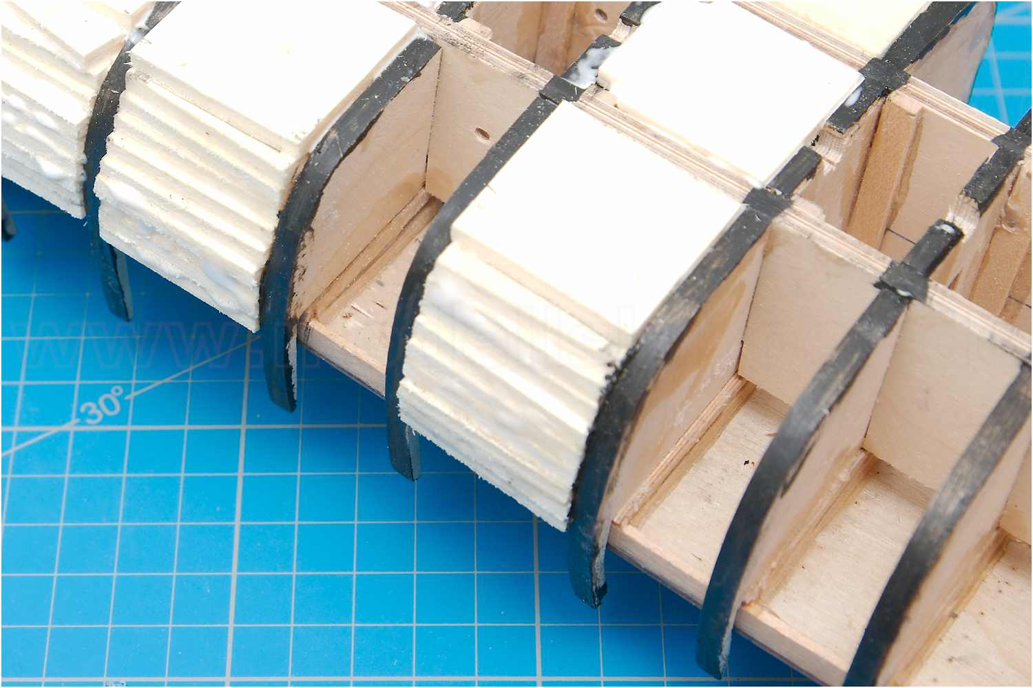 Dann, beginnend von der Unterkante Deck zum Kiel, schichtweise Füllhölzer einkleben und mit einer Zwinge fixieren.
