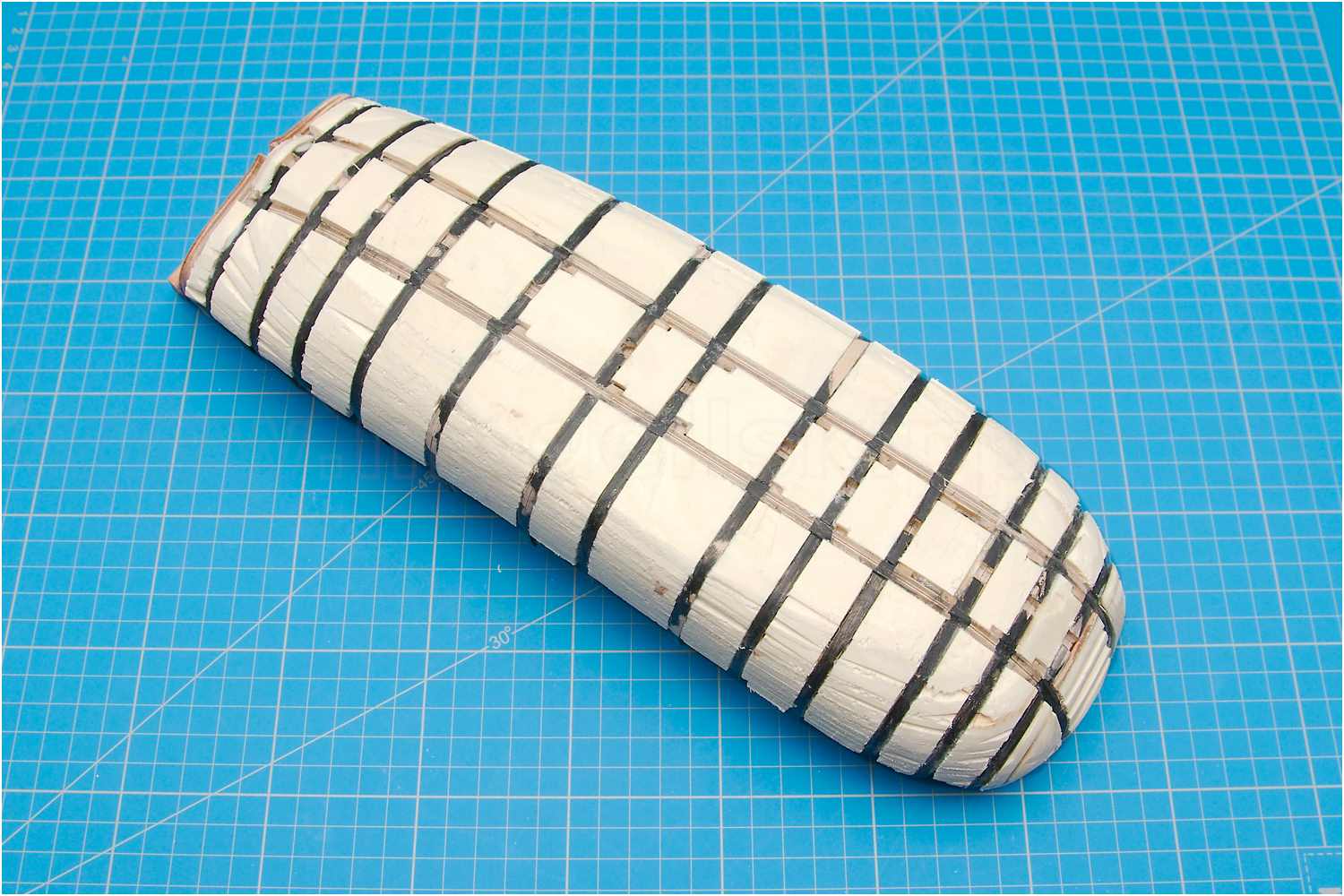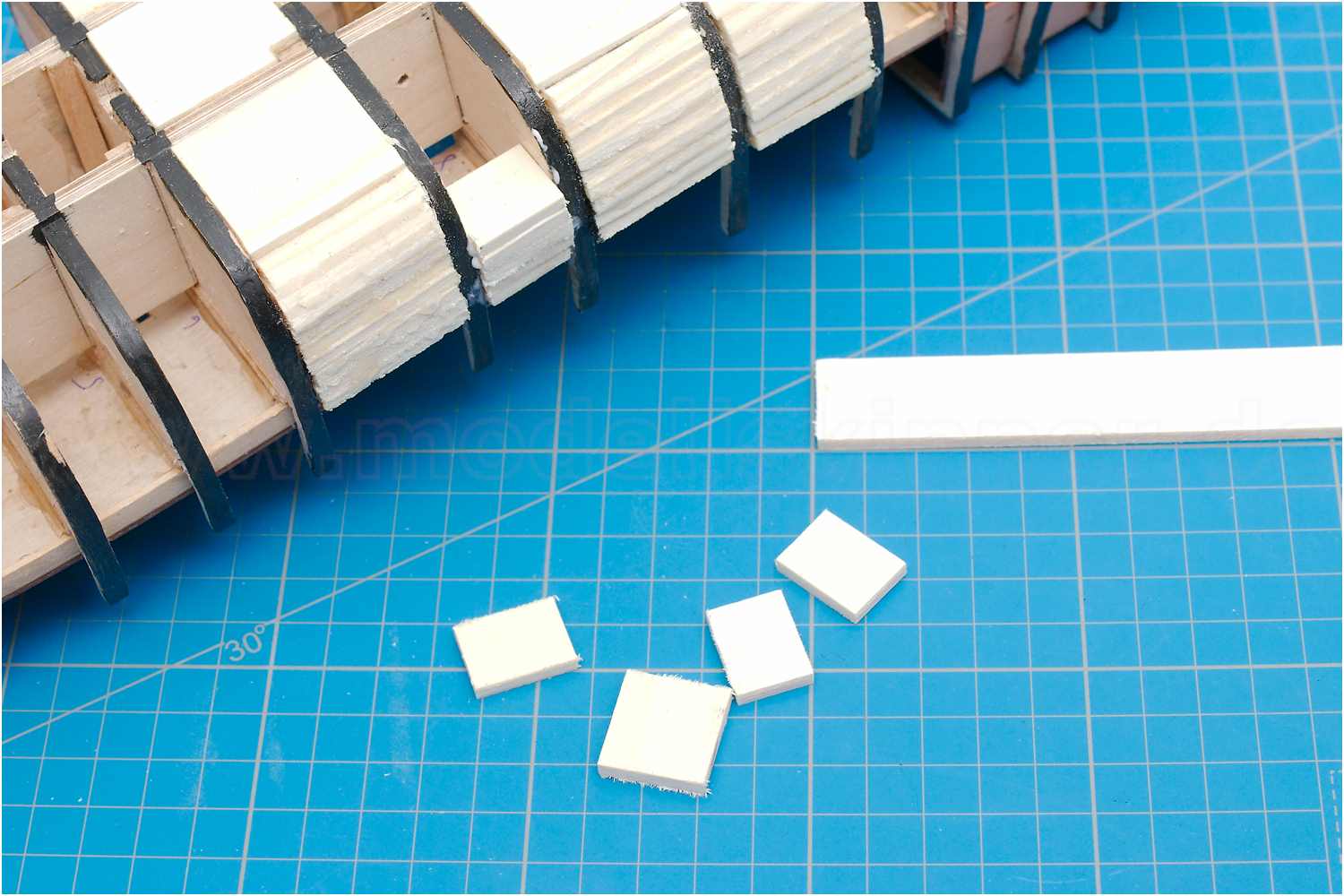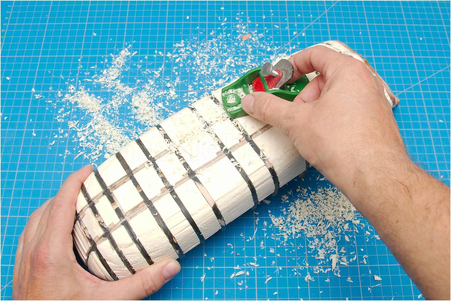 Eine mittlerweile recht verbreitete Methode zur Herstellung von Modellrümpfen ist, in die Zwischenräume der Mallen kleine Holzstücke zu kleben, die dann abgeschliffen werden, um die gewünschte Form des Rumpfes zu erhalten.