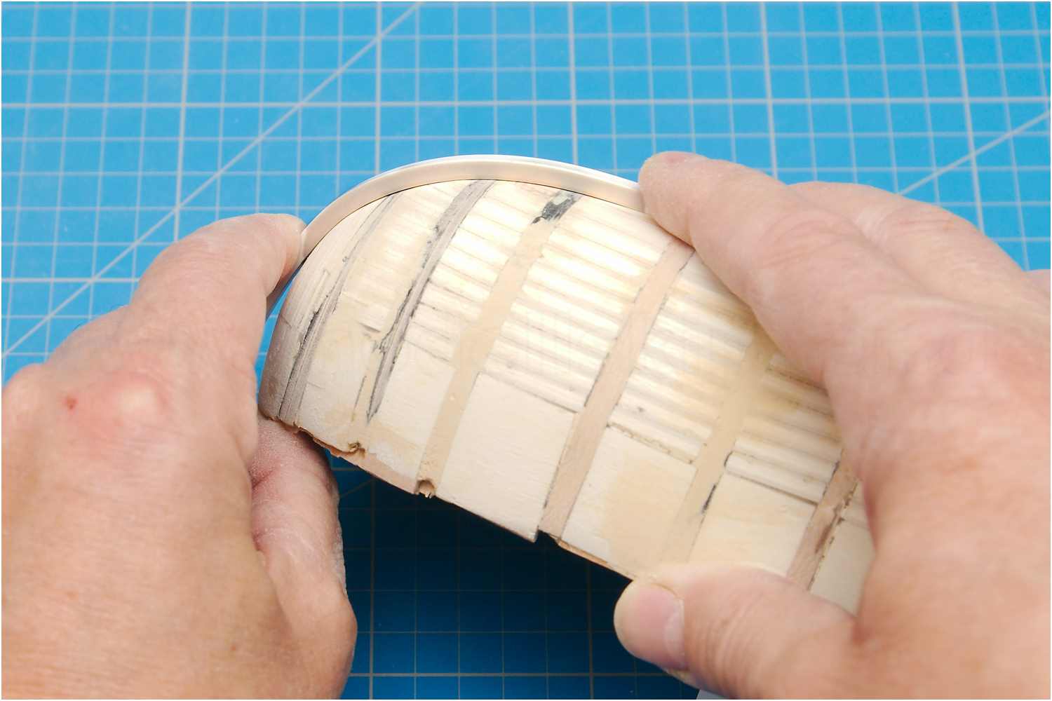 Zwischendurch prüfe man den Verlauf der Rumpflinien mit einer Strakleiste, die glatten Flächen mit einer Holzleiste und die Rundungen am Bug am besten mit einem Kunststoffprofil, da es sich gut anschmiegen lässt, ohne zu brechen.