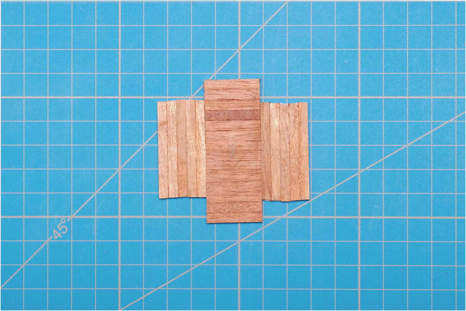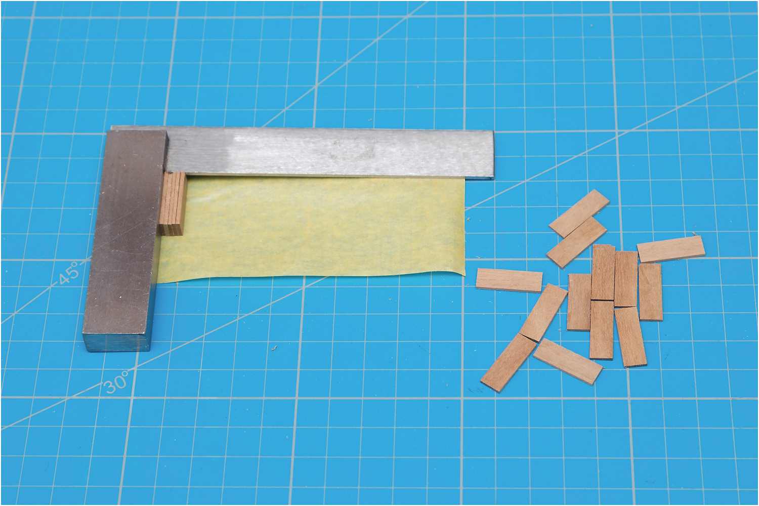 Dafür habe ich das Kreppband unter einen Winkel gelegt und konnte so die Leistenstücke recht einfach zu einem Block zusammenstellen.