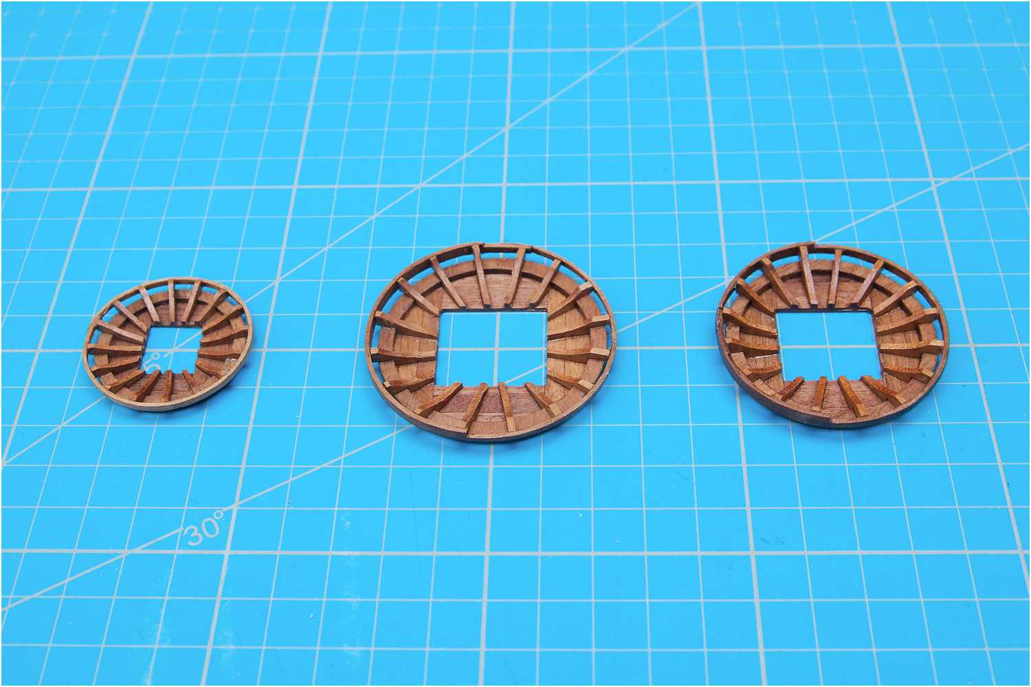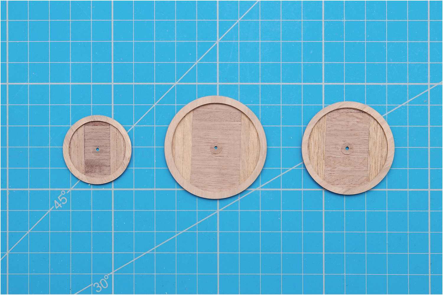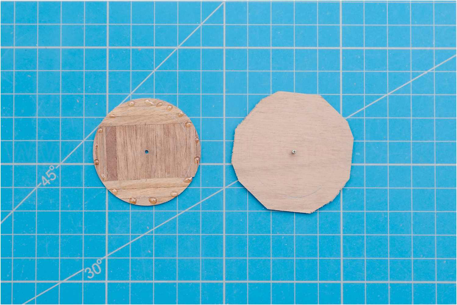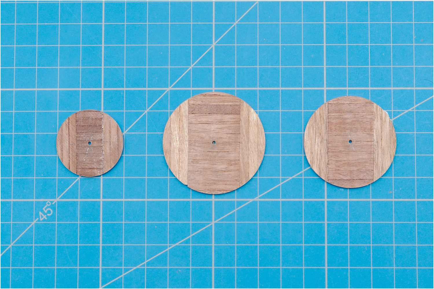 Der Boden der Plattformen wurde aus einzelnen Leisten zusammengeklebt und mit Hilfe eines Aufnahmedorns für Trennscheiben in der Handbohrmaschine auf Maß abgeschliffen.