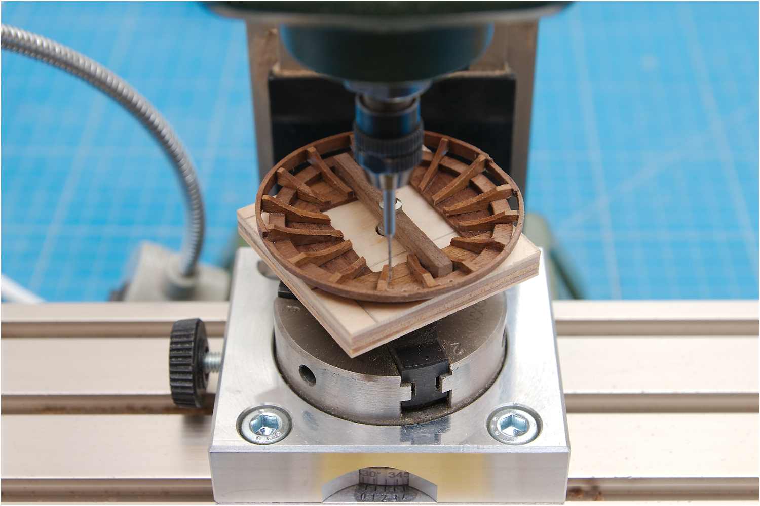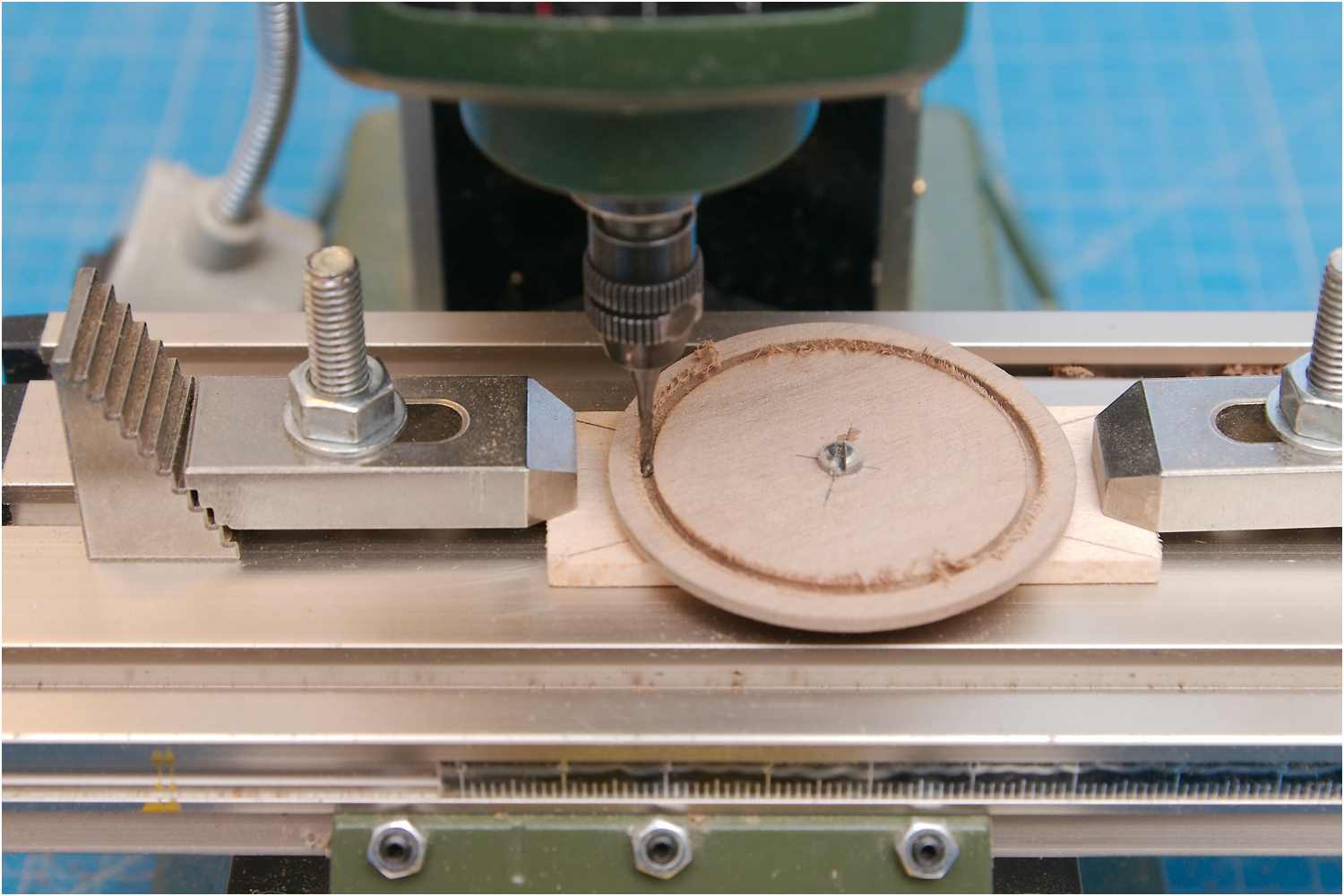 Dazu habe ich eine Furnierholzplatte auf die Plattform gesetzt und diese nur am Rand mit wenigen Klebepunkten verklebt und dann wieder in der Handbohrmaschine abgerundet.