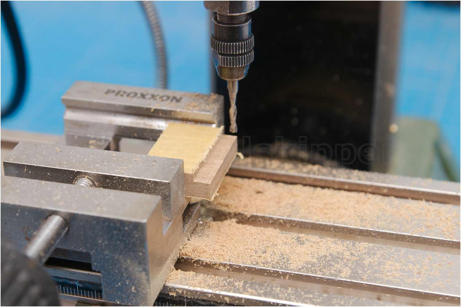 Zuerst auf der Unterseite den Absatz für den Marsrand eingearbeitet, wieder Malerkrepp aufgeklebt und umgedreht eingespannt, etwas geneigt um die nun die Oberseite verjüngen zu können.