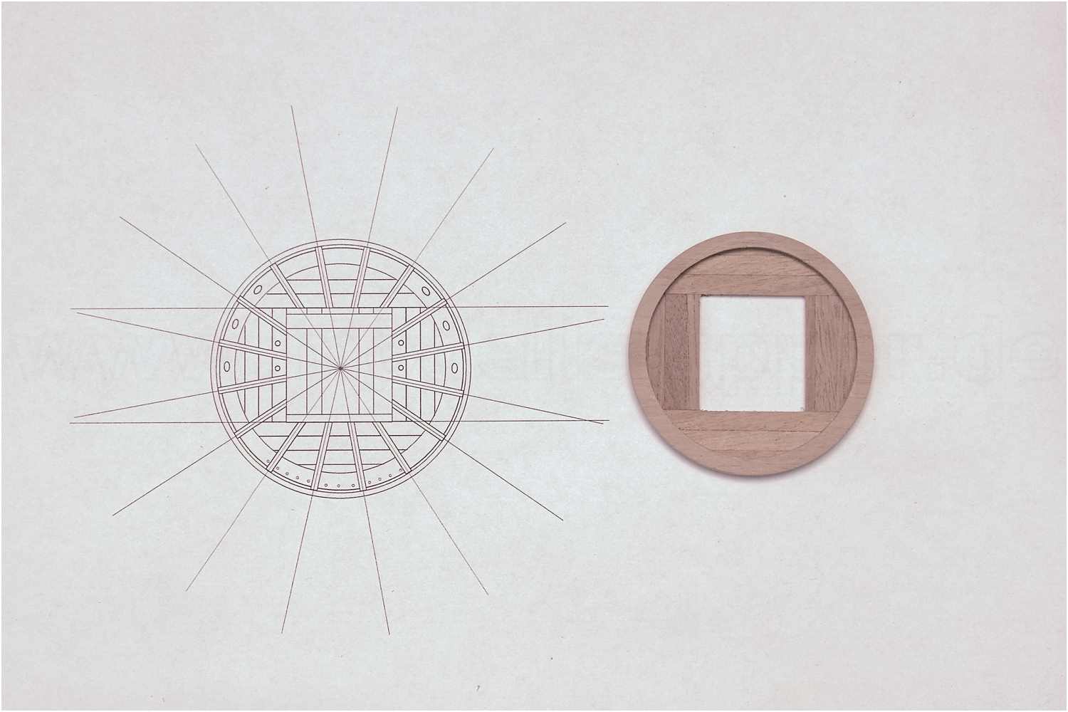 Für die korrekte Ausrichtung beim Aufkleben der Rippen habe ich mir die Planzeichung ausgedruckt und nachdem die Öffnung im Boden, das sog. Soldatengatt, ausgeschnitten wurde, habe ich die Plattform mit doppelseitigem Klebeband auf der Zeichnung fixiert.