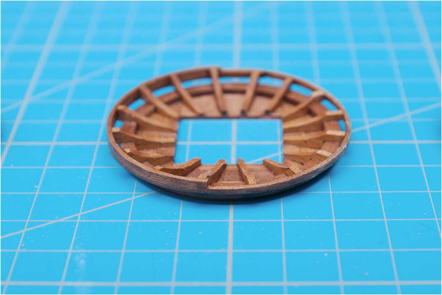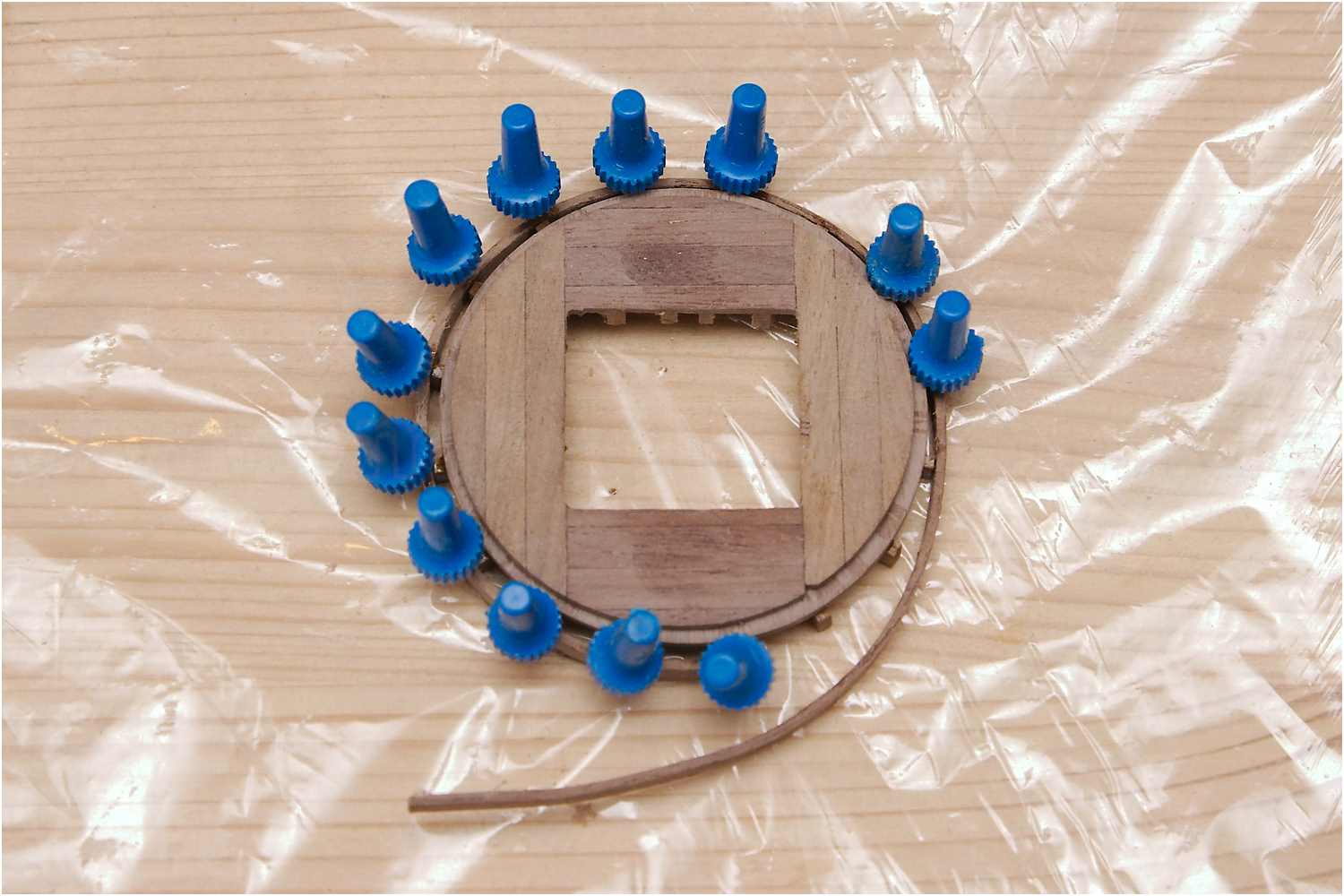 Der Abschlussring wurde vorgebogen, die Plattform verkehrt herum auf ein Holzbrettchen mit Frischhaltefolie gelegt und der Ring an die Rippen geklebt.