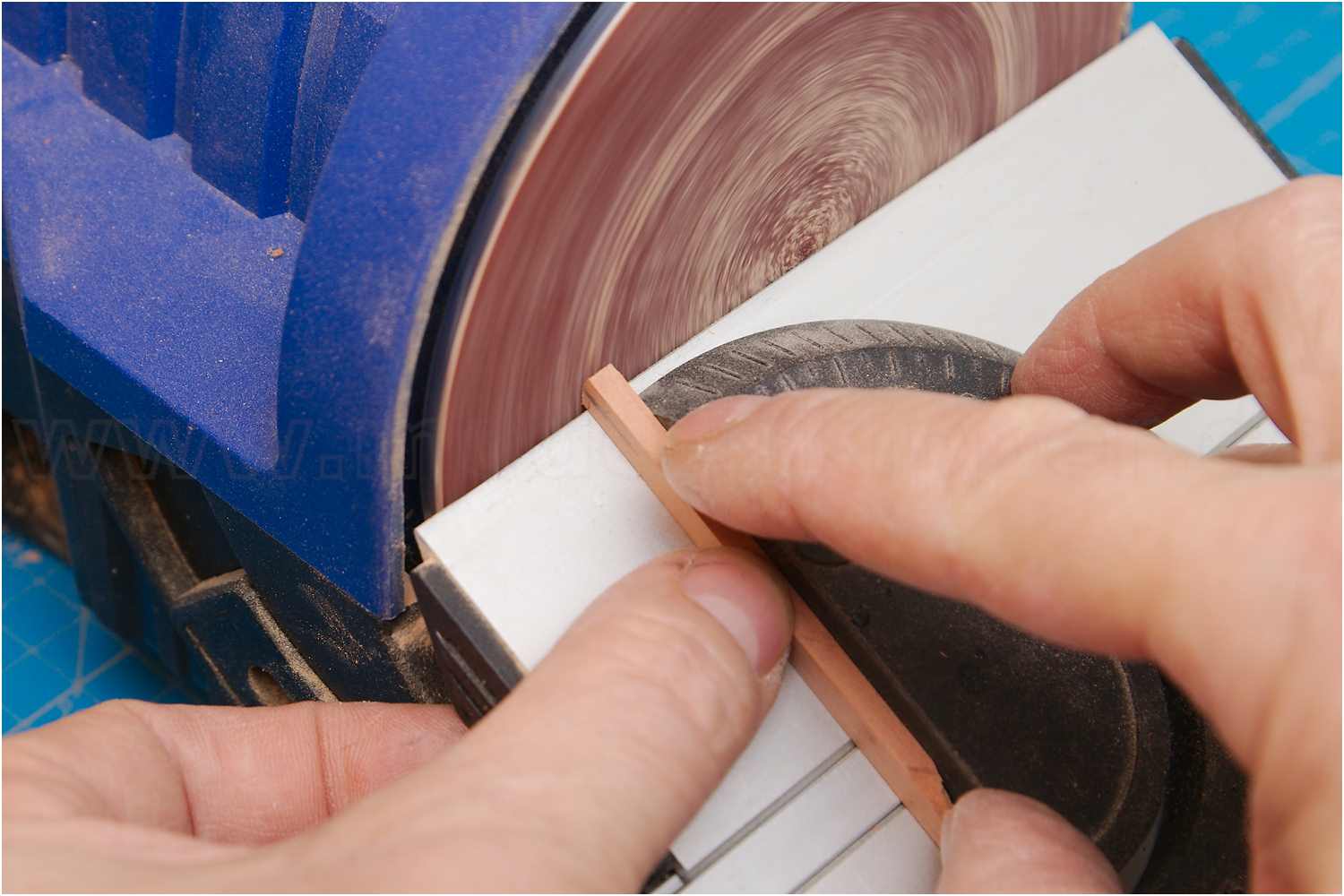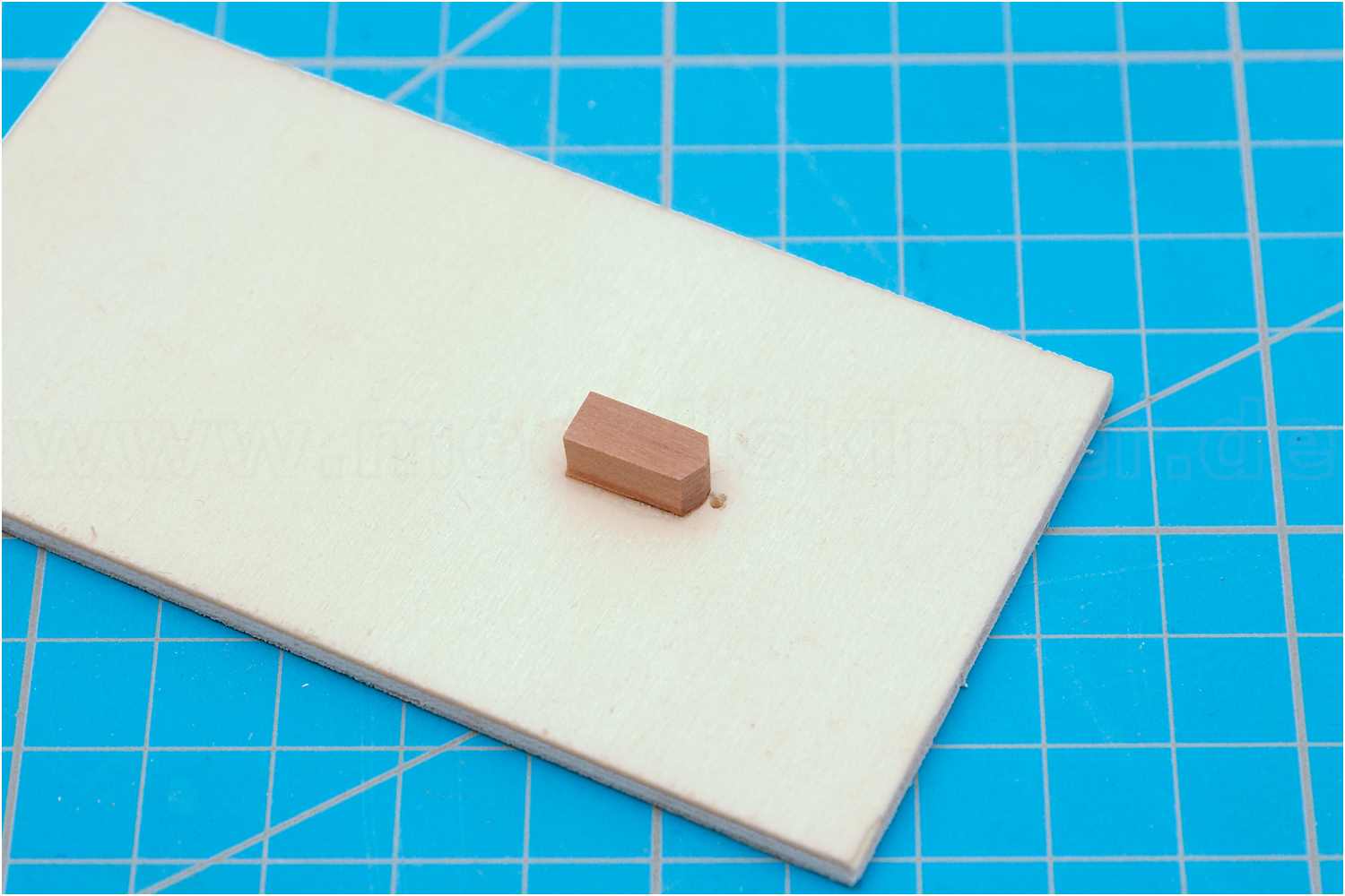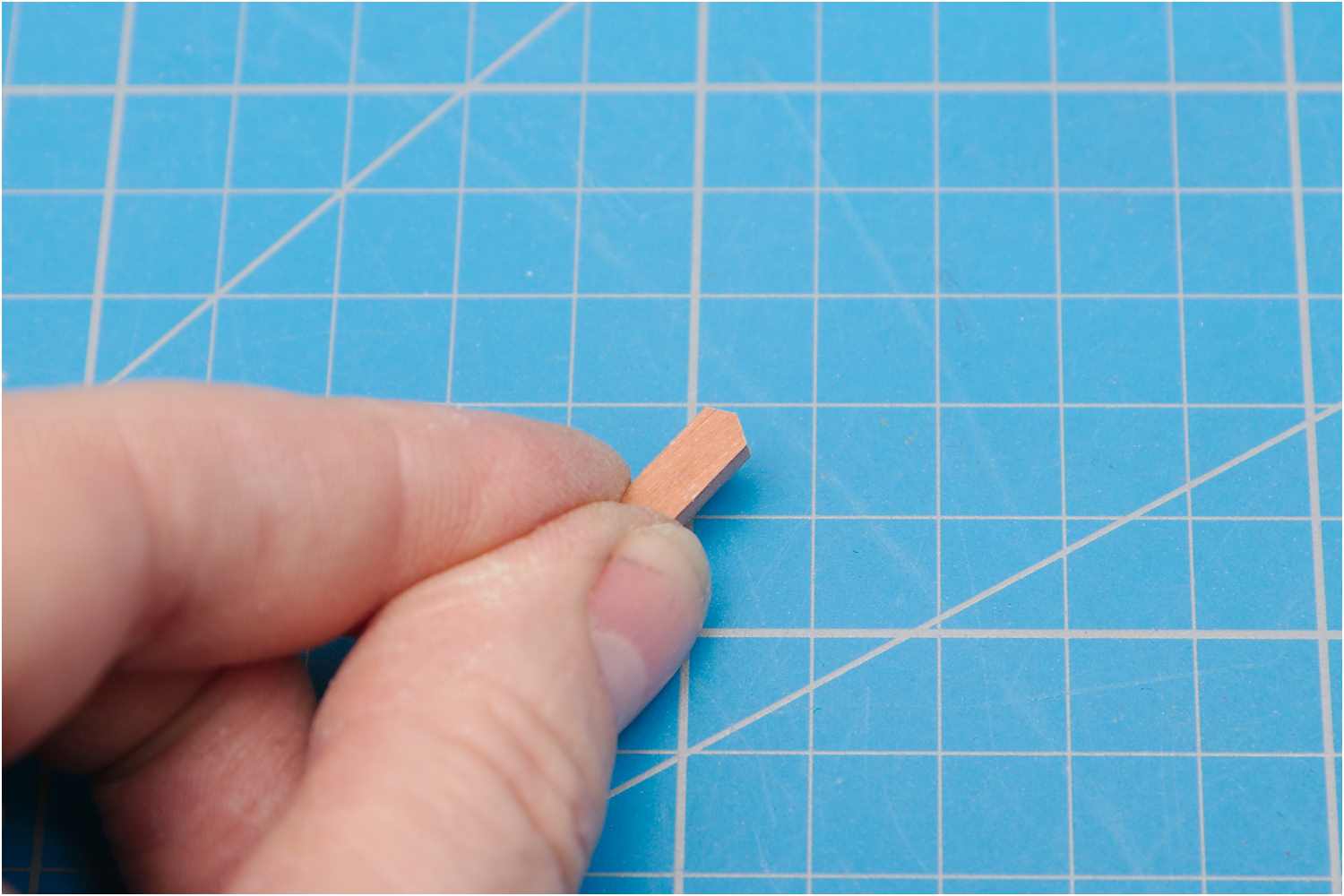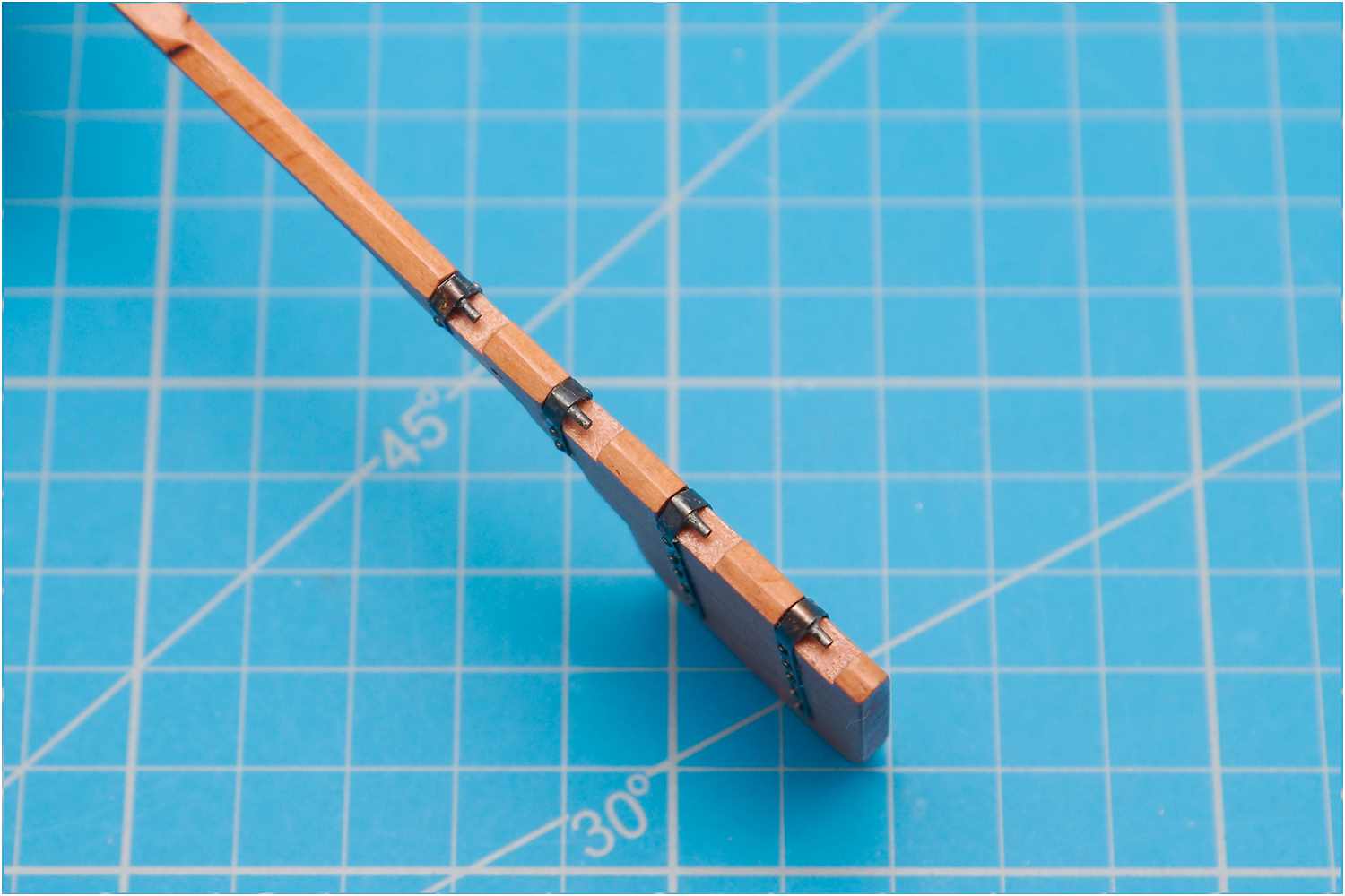 Damit sich das Ruder später ungehindert um seine Drehachse bewegen kann, ist die Außenseite des Ruderschaftes beidseitig schräg angeschliffen, entsprechend fertigt man sich auch die Leiste der Löthilfe.