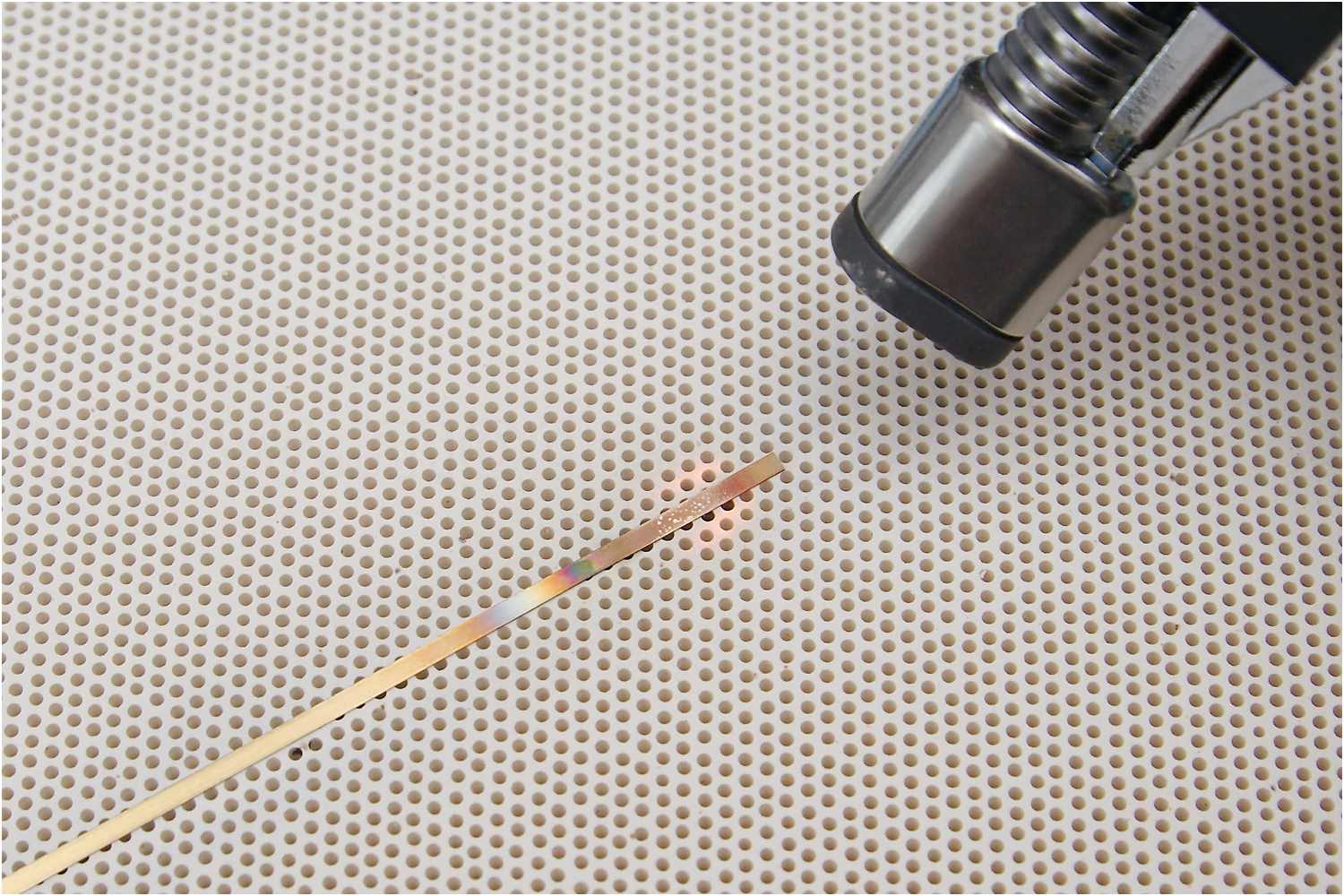 Vor der angeschliffenen Leiste der Löthilfe bohrt man mittig ein Loch, sodass sowohl der Fingerling, als auch ein Röhrchen für die Öse des Gegenstücks in das Loch gesteckt und genau senkrecht an das Scharnierband gelötet werden kann.
