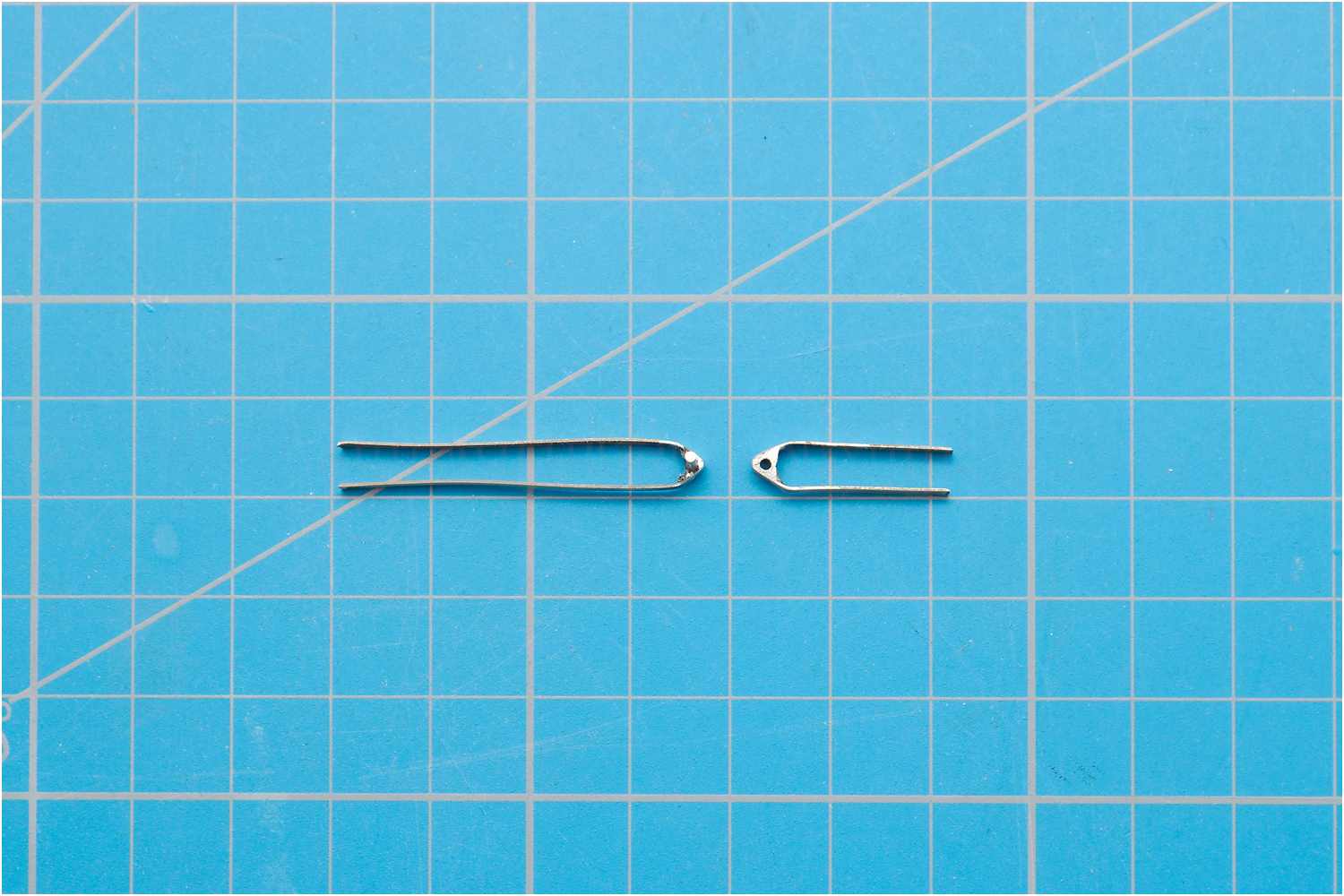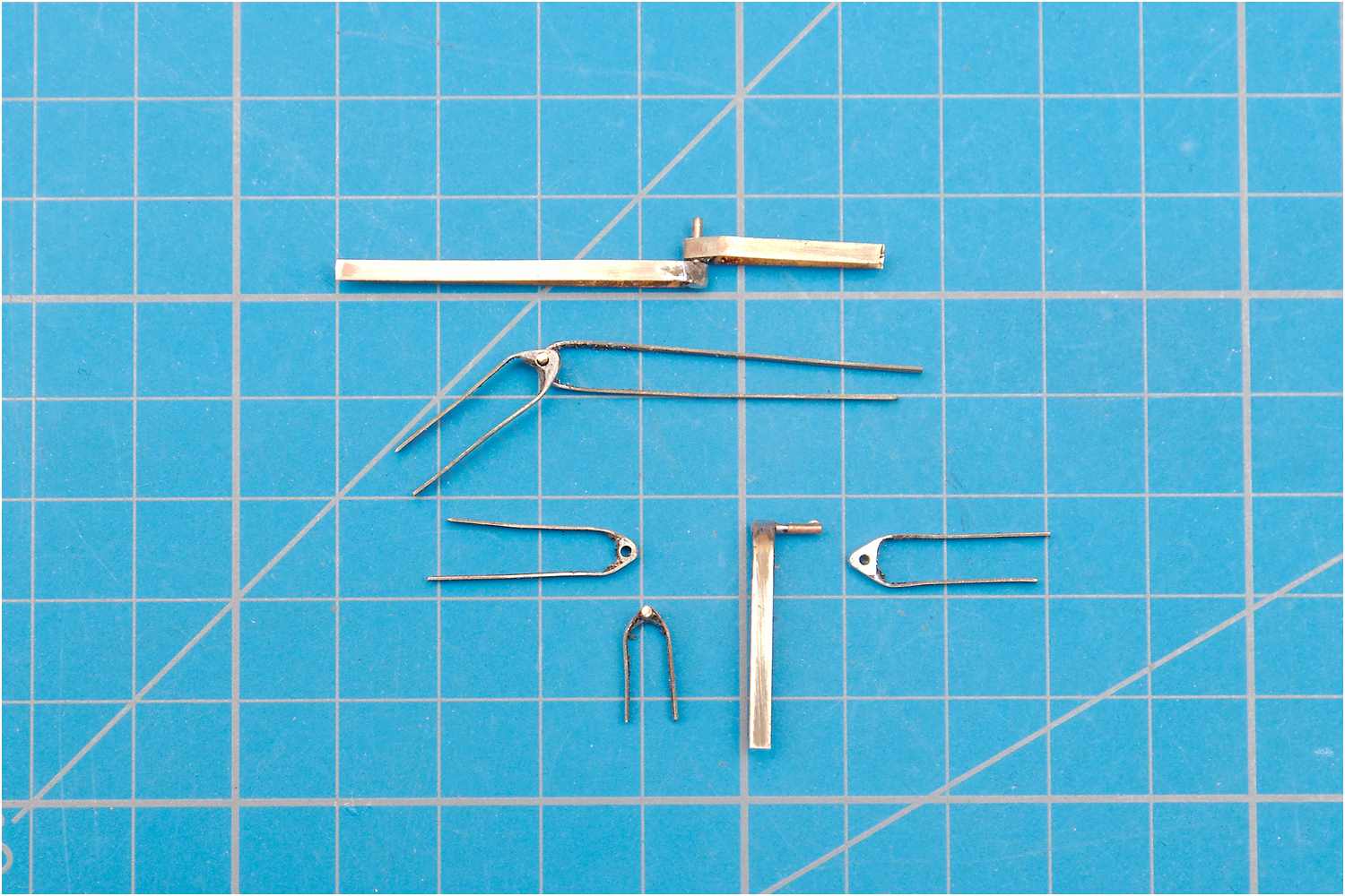 Die Rohlinge der Ruderscharniere, nach dem Entfernen überflüssigen Lötzinns, fertig zum Bohren der Löcher für die Bolzen.