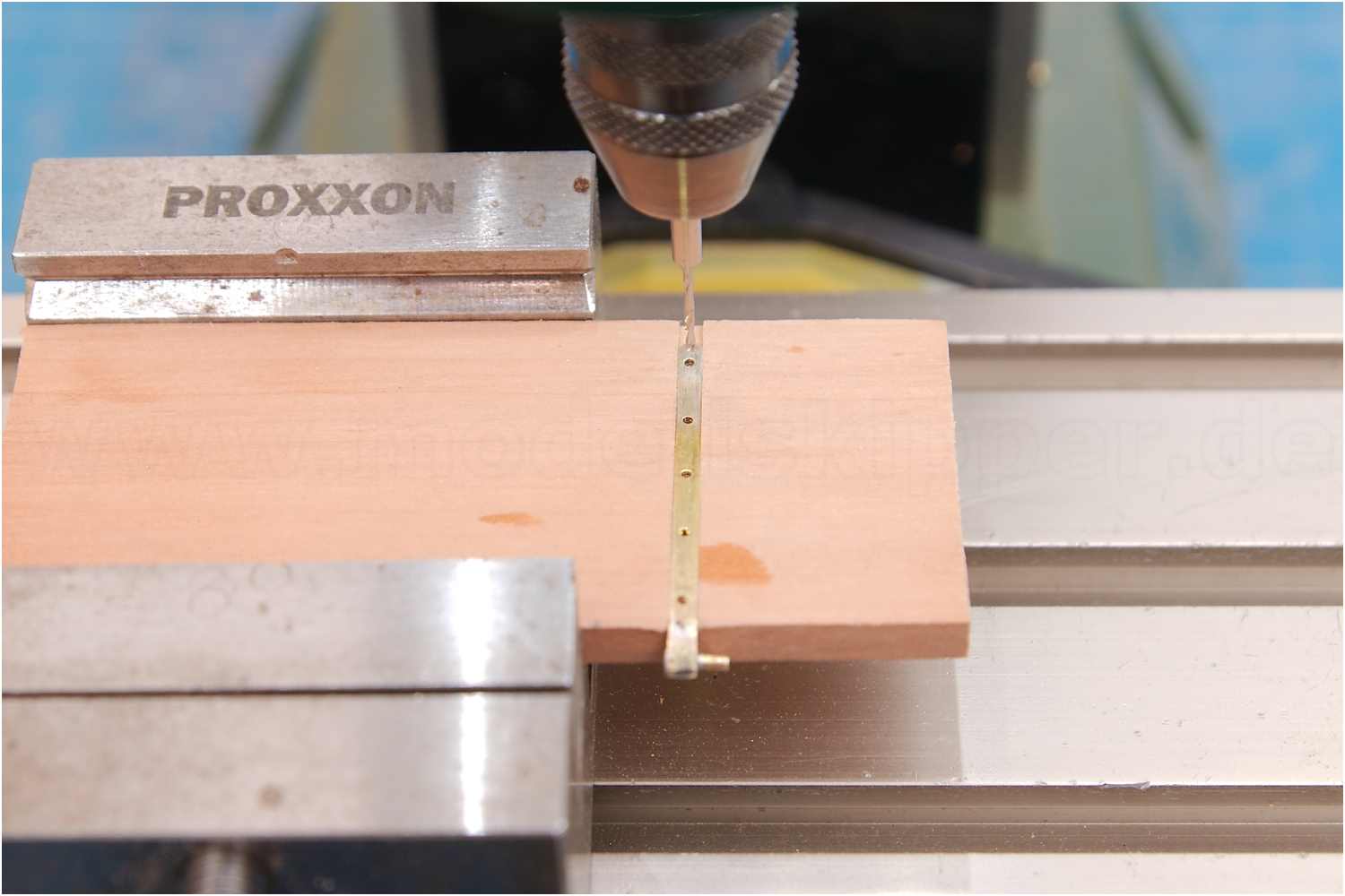 Damit sich das dünne Blech nicht verzieht, oder gar um den Bohrer wickelt, nutze ich ein Stück Hartholz mit einer Nut als Bohrhilfe.