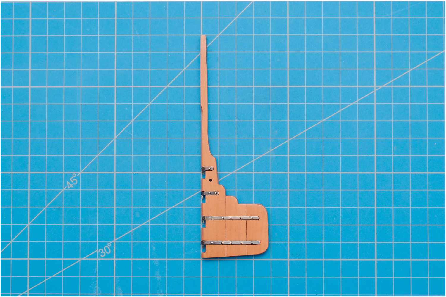 Wenn an einem Standmodell das Ruder ohne Funktion ausgeführt werden kann, können die Scharnierbänder aus Pappe gefertigt werden, andernfalls besorgt man sich entsprechende Messingstreifen. Diese am besten ausglühen, damit sie sich besser biegen lassen.
