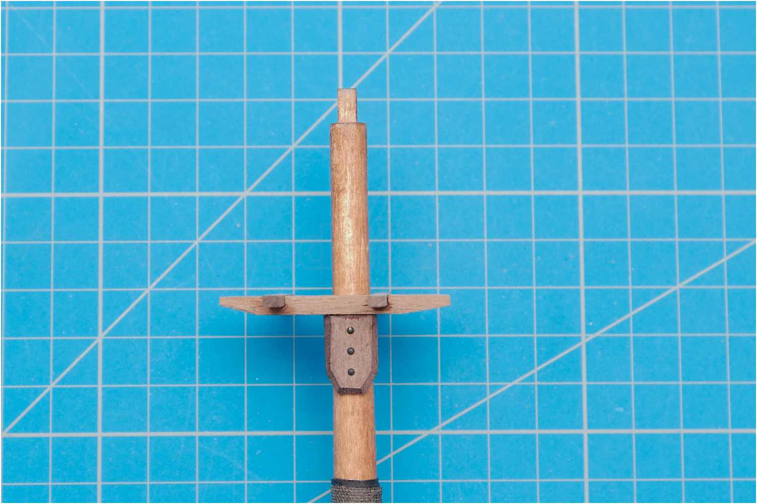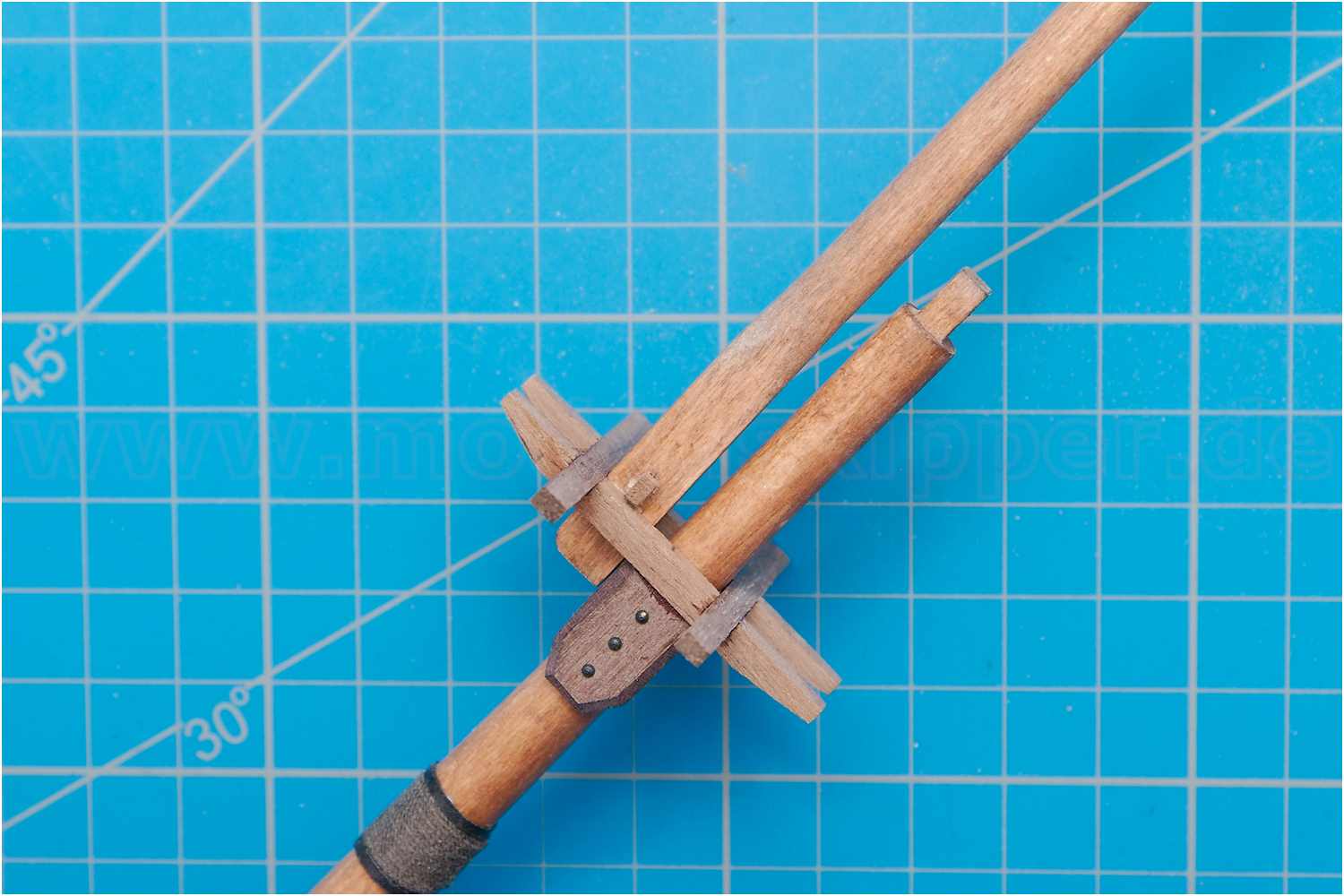 An der Vorderseite zwischen den Mastbacken ist ein Abstandsholz angebracht, um Platz für die Wanten zwischen Masttopp und Stenge freizuhalten. Zwischen diesem Querholz und der vorderen Quersaling hat man so das Lager für den Stengefuß, der mit dem sog. Schlossholz gegen Durchrutschen gesichert ist.