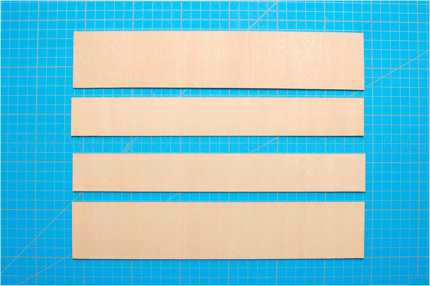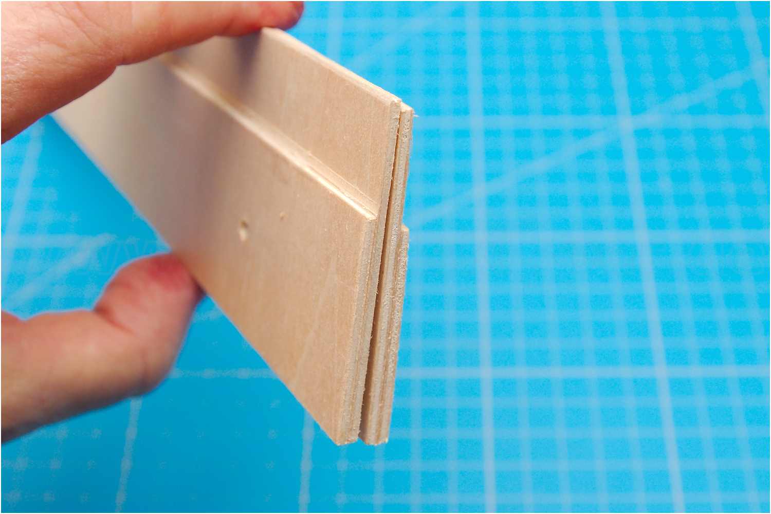 Je ein etwas schmaleres Brettchen habe ich auf eine breiteres geklebt. Zum einen aus Stabilitätsgründen, da ich nur 2-mm-Sperrholz verwendet habe, andererseits wollte ich eine möglichst dünnen Arbeitskante haben.