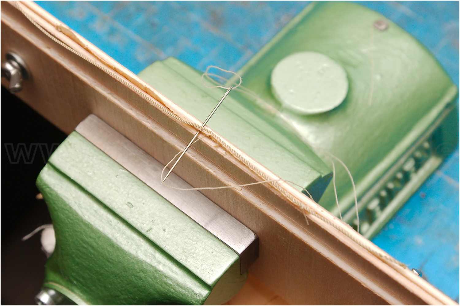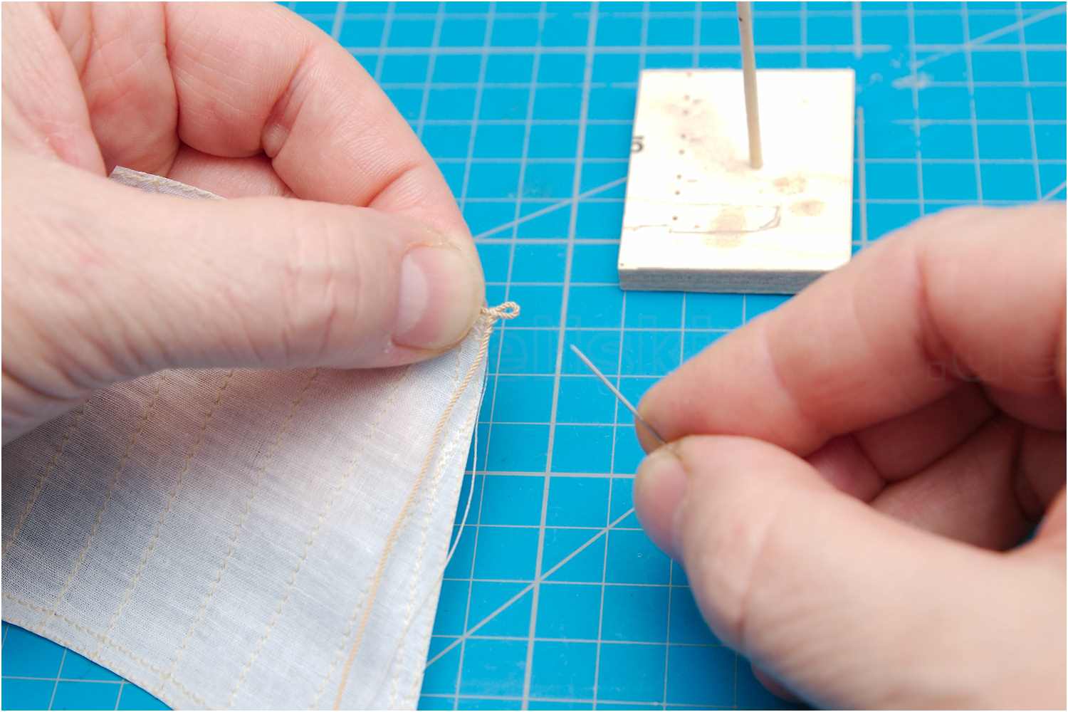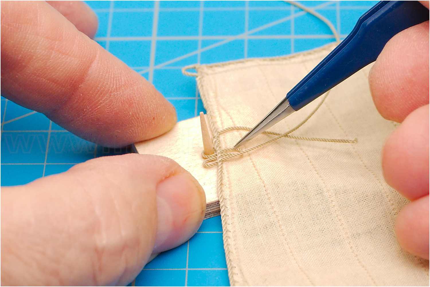 Mit einem Hohlspieker fädle man den Legel durch das Liektau, ein Zahnstocher hilft dabei, dass alle Legel am Segel die gleiche Größe haben.