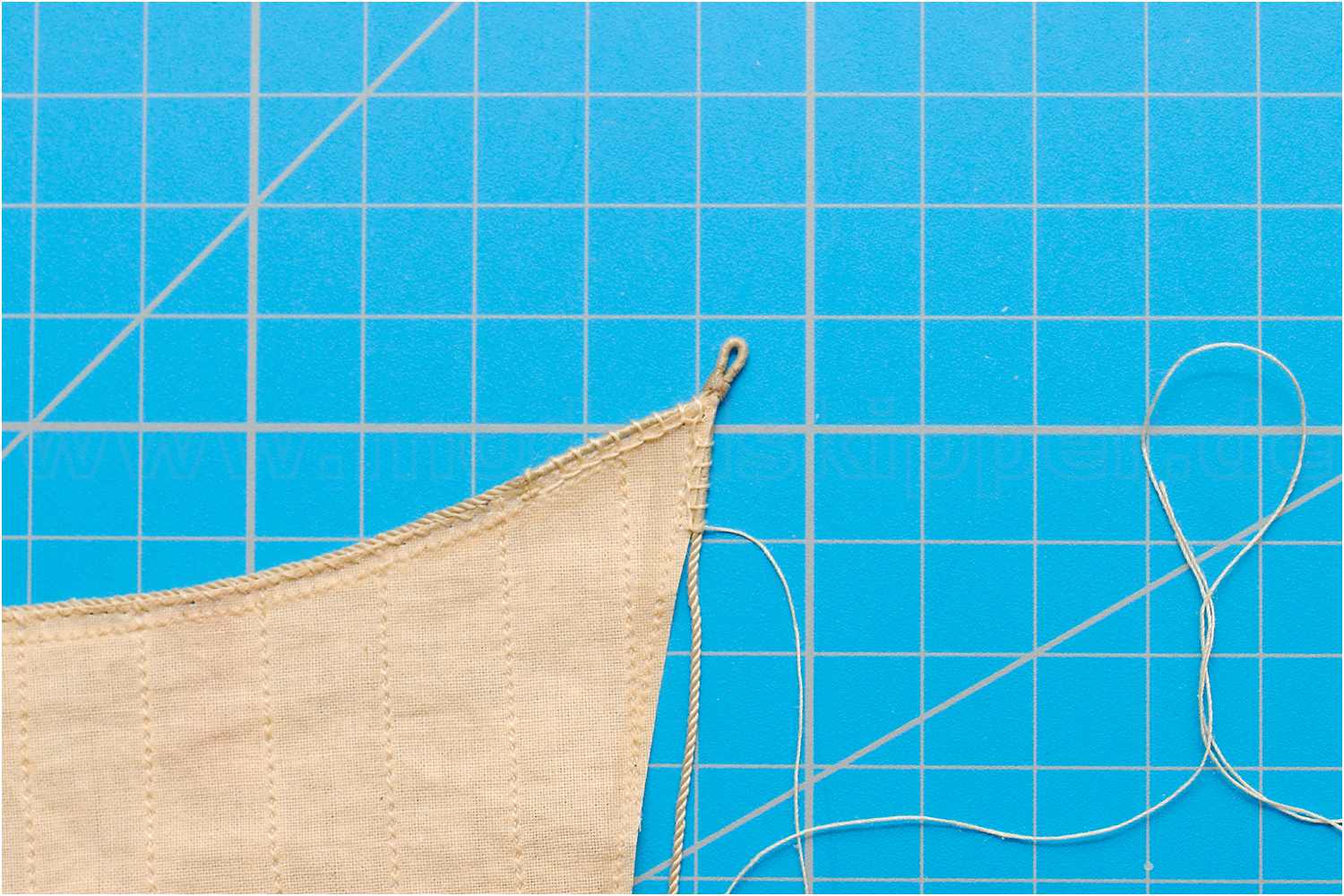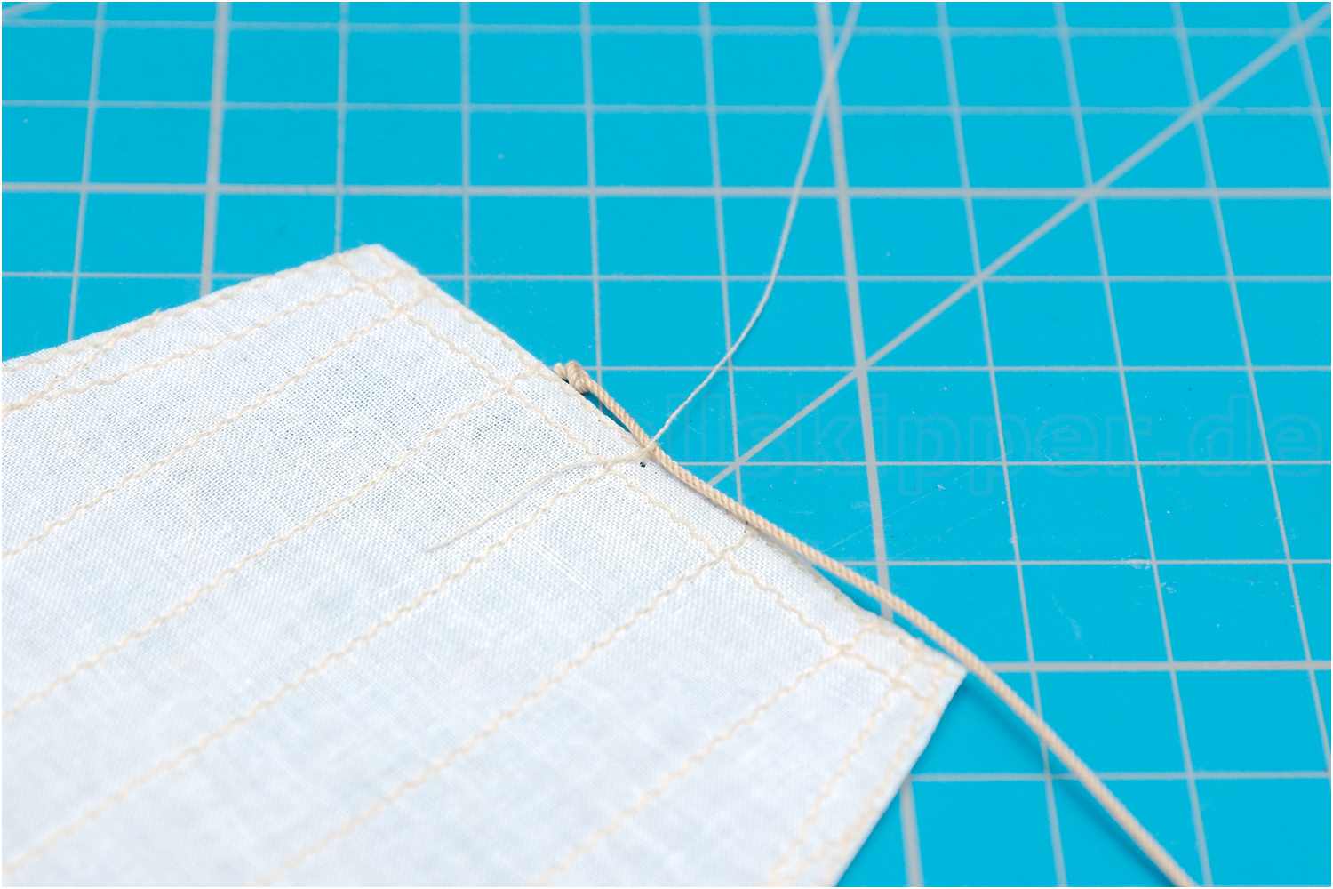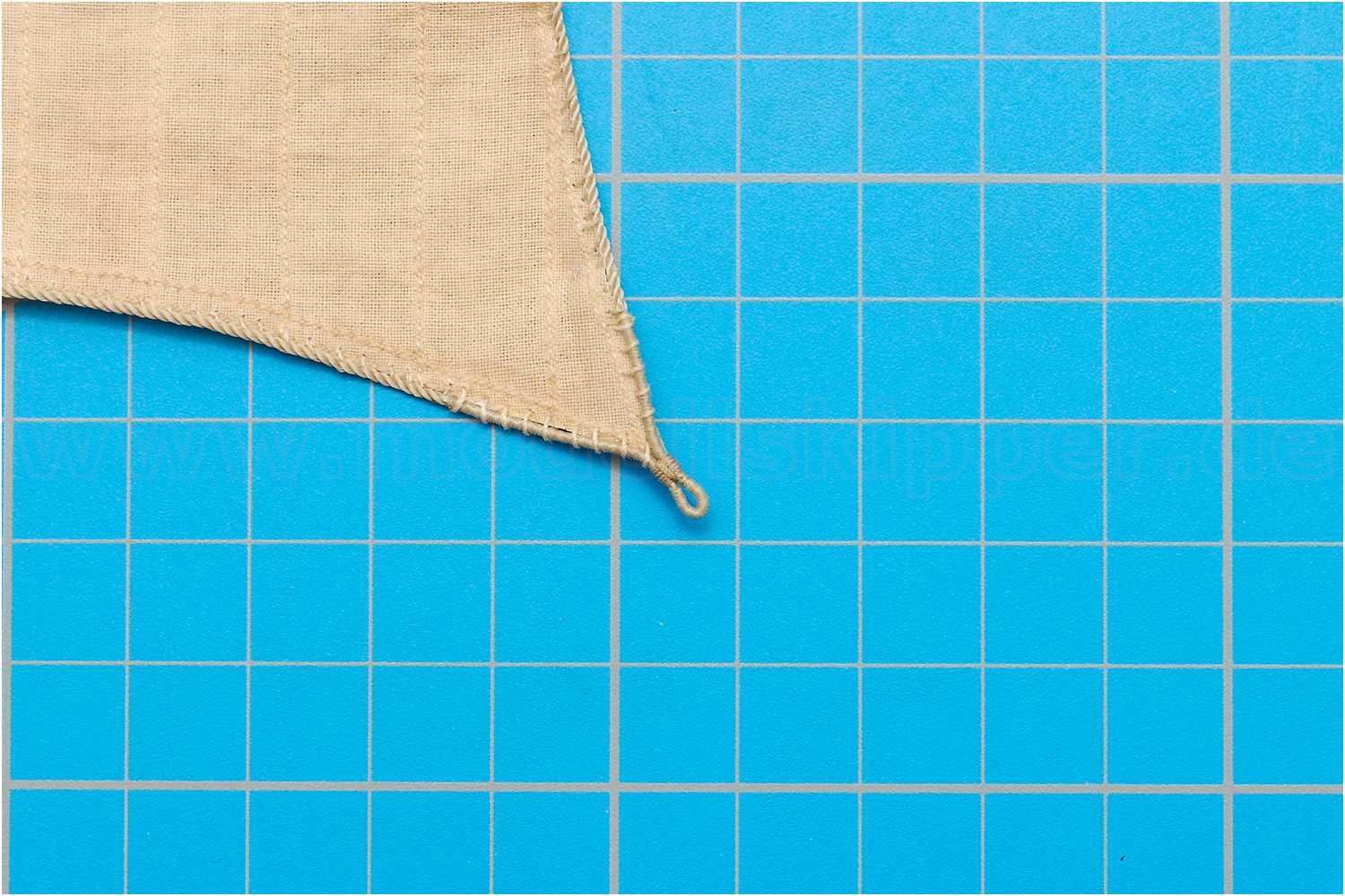 Das Liektau nähe ich mit der Hand an und beginne mittig am Kopfliek des Segels. Da ich rechtsgeschlagenes Tau verwende, steche ich die Nadel oben in den Stoff, dann verläuft der Faden wie die Rillen des Liektaus.