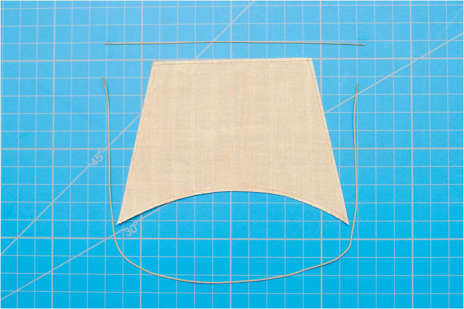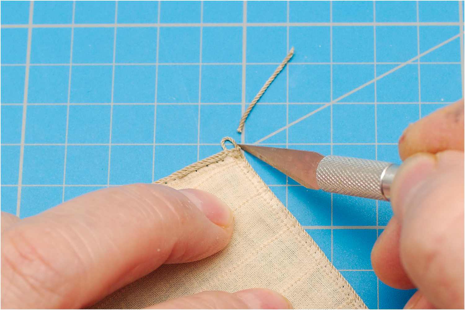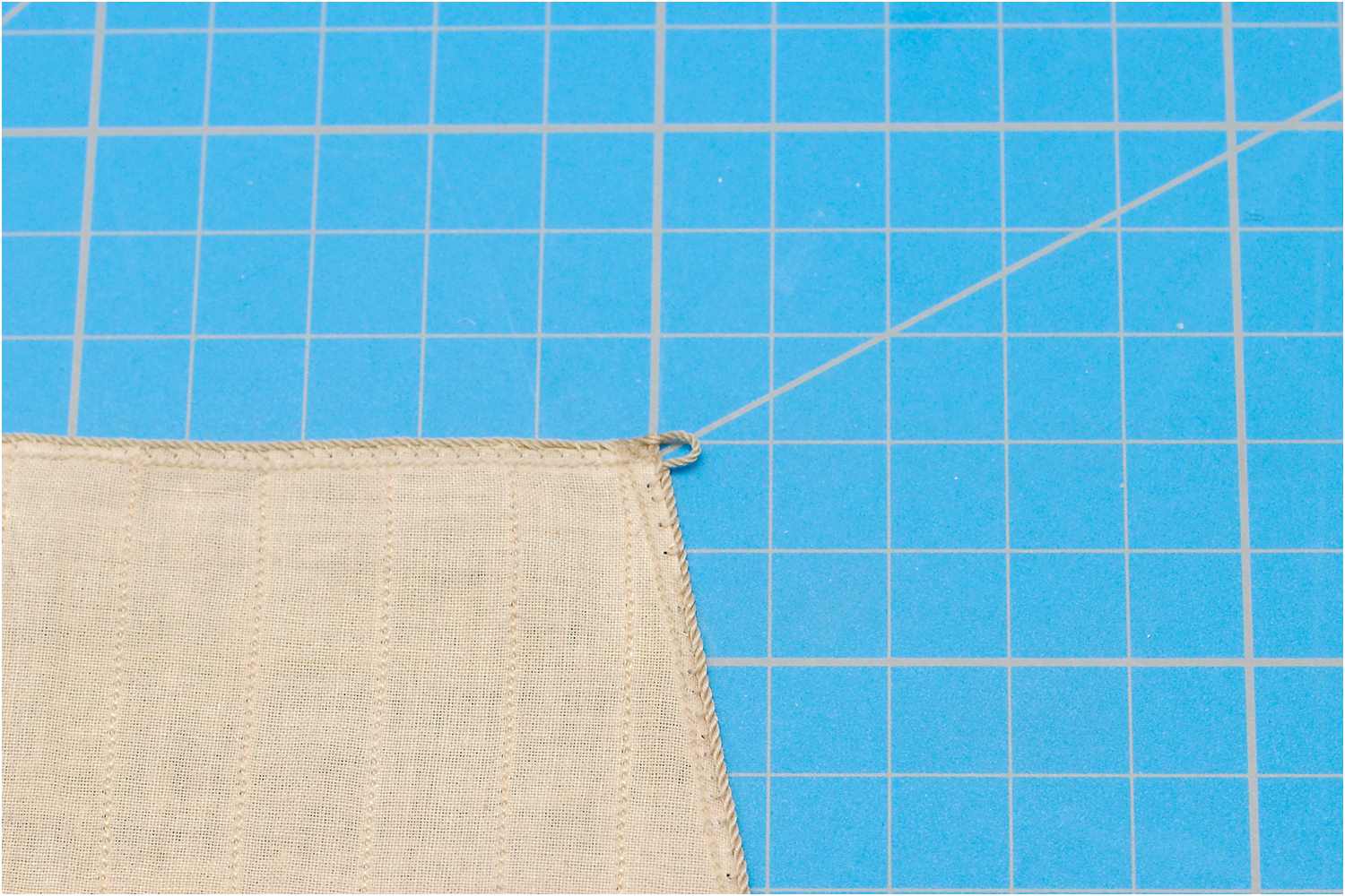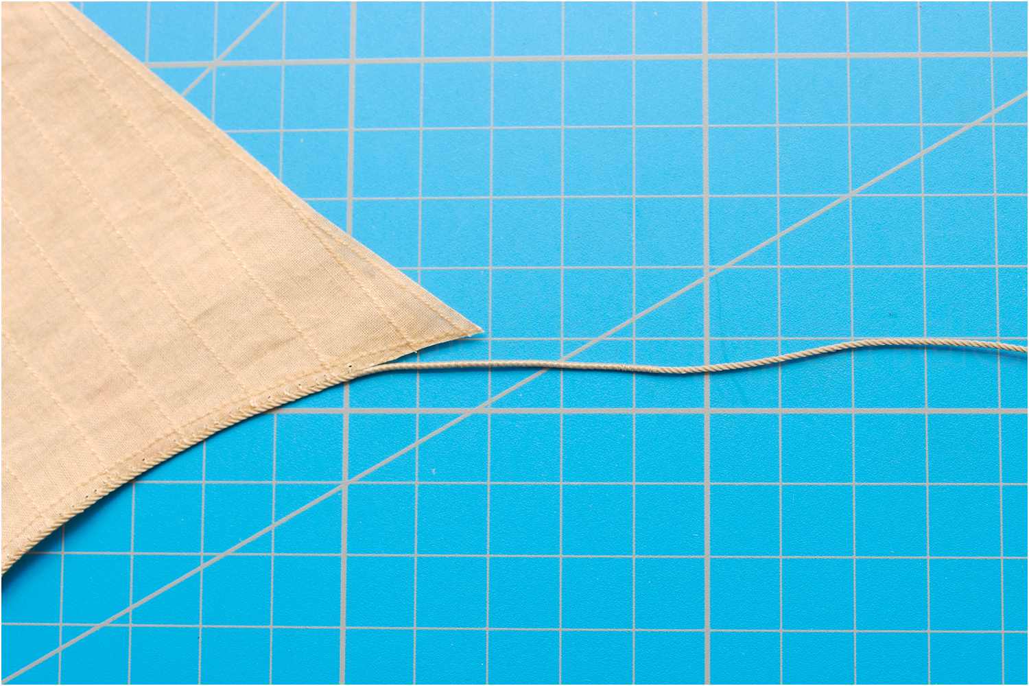Das Liektau nähe ich mit der Hand an und beginne mittig am Kopfliek des Segels. Da ich rechtsgeschlagenes Tau verwende, steche ich die Nadel oben in den Stoff, dann verläuft der Faden wie die Rillen des Liektaus.
