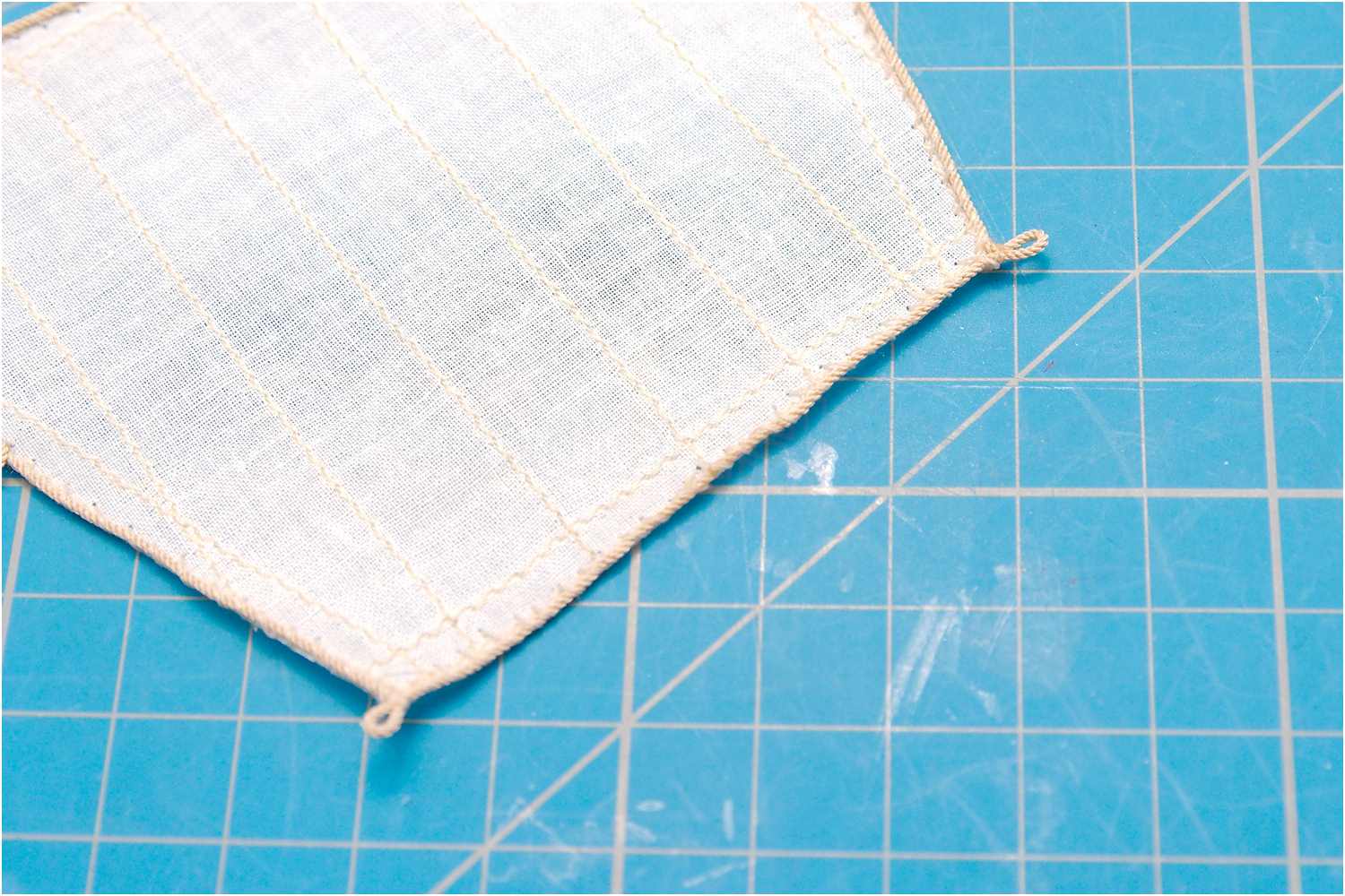 Ich nähe bis zur äußern Ecke des Lieks und forme dann eine Schlaufe für das Nocklegel. Ein Zahnstocher hilft dabei, dass alle Legel am Segel die gleiche Größe haben.