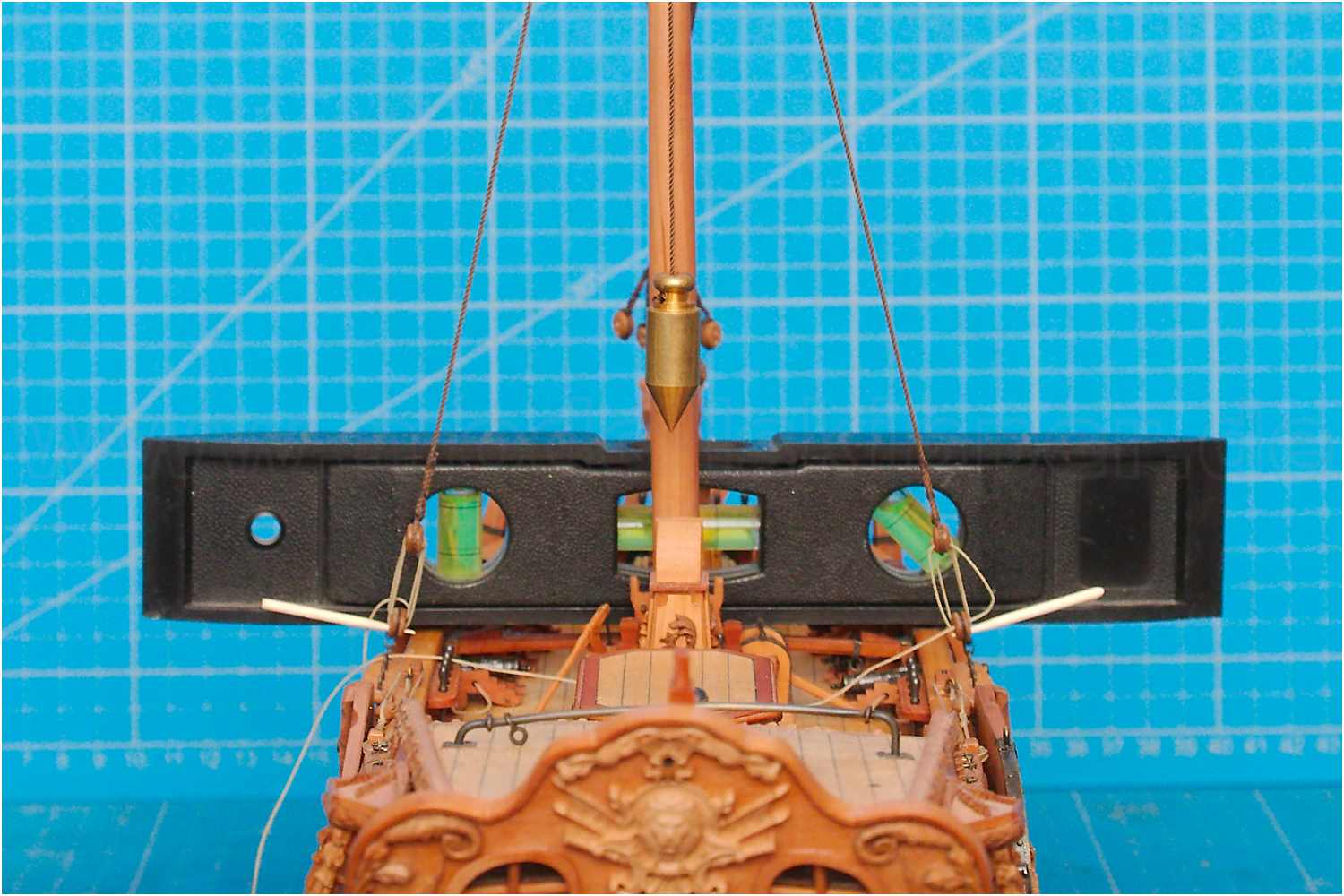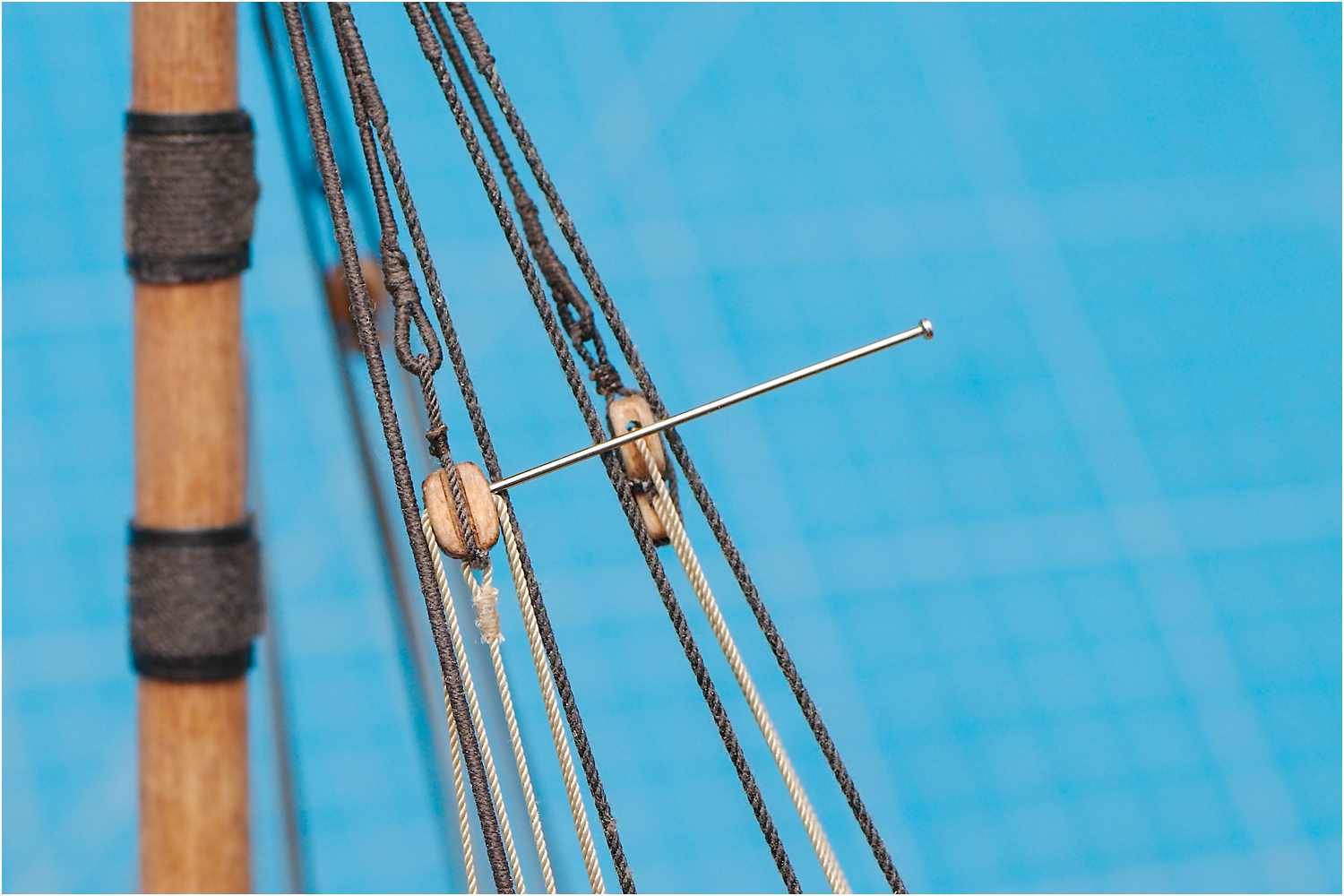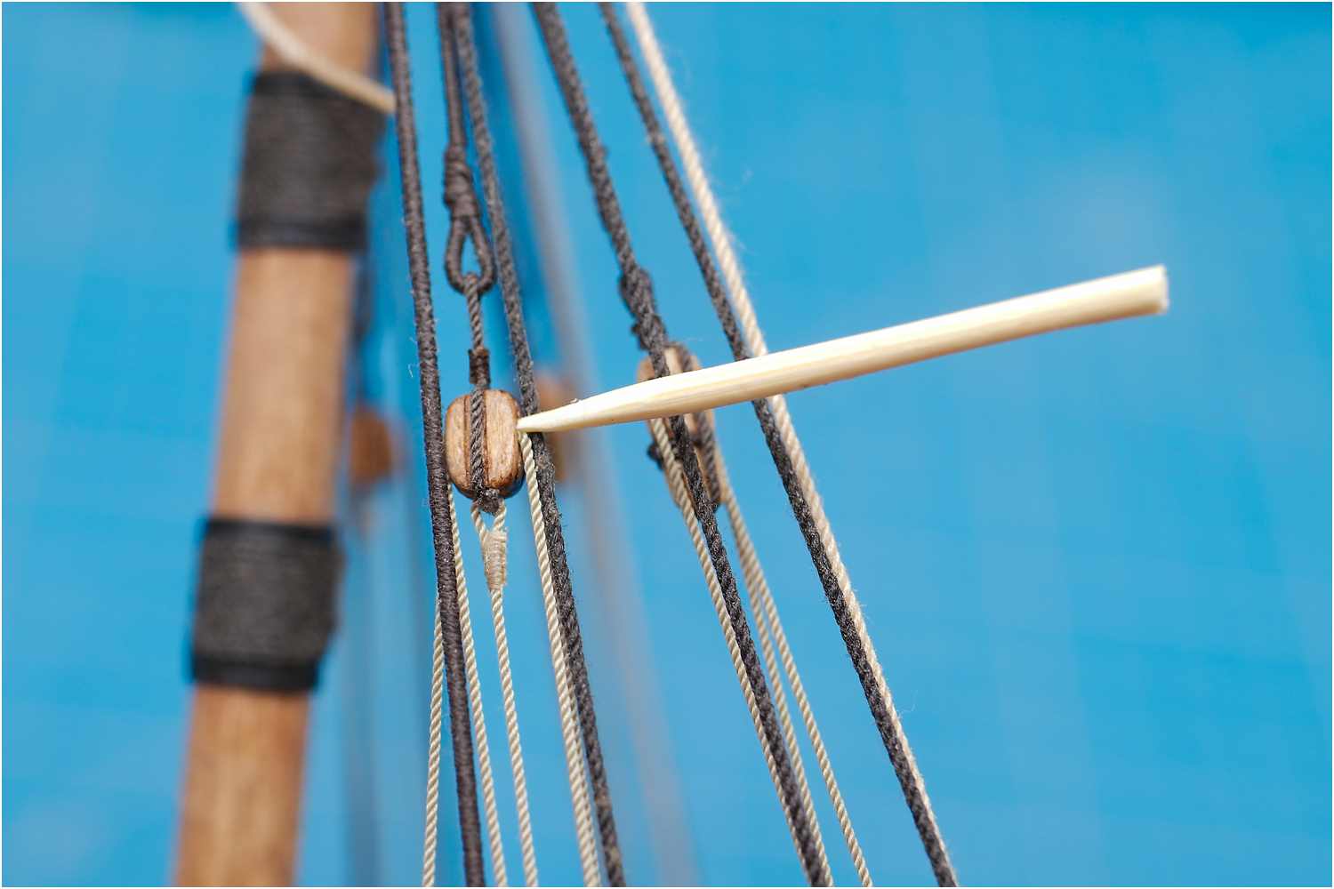 Um beim Steifsetzen das Durchrutschen des Taus zu vermeiden, fixiert man es mit einem Zahnstocher o. Ä. im Loch des Blocks oder der Juffer.