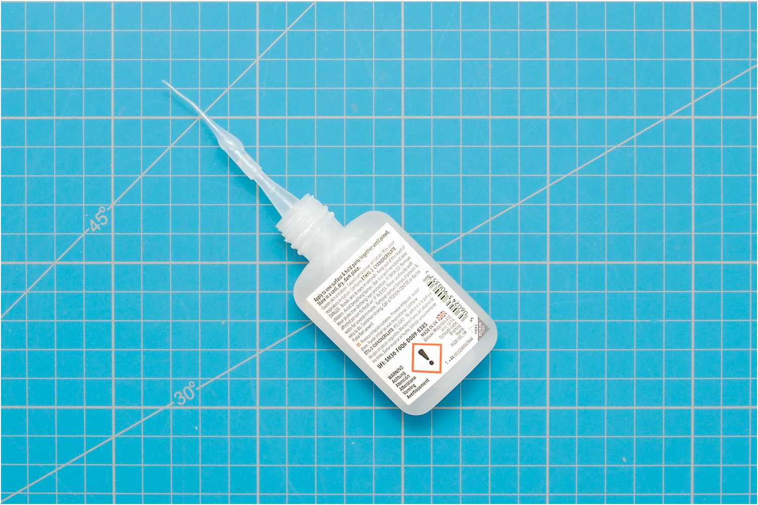Applikatoren für Sekundenkleber, Kunststoffplatte zum Ablegen kleiner Mengen und Nadelhalter zum punktuellen Dosieren des Klebers