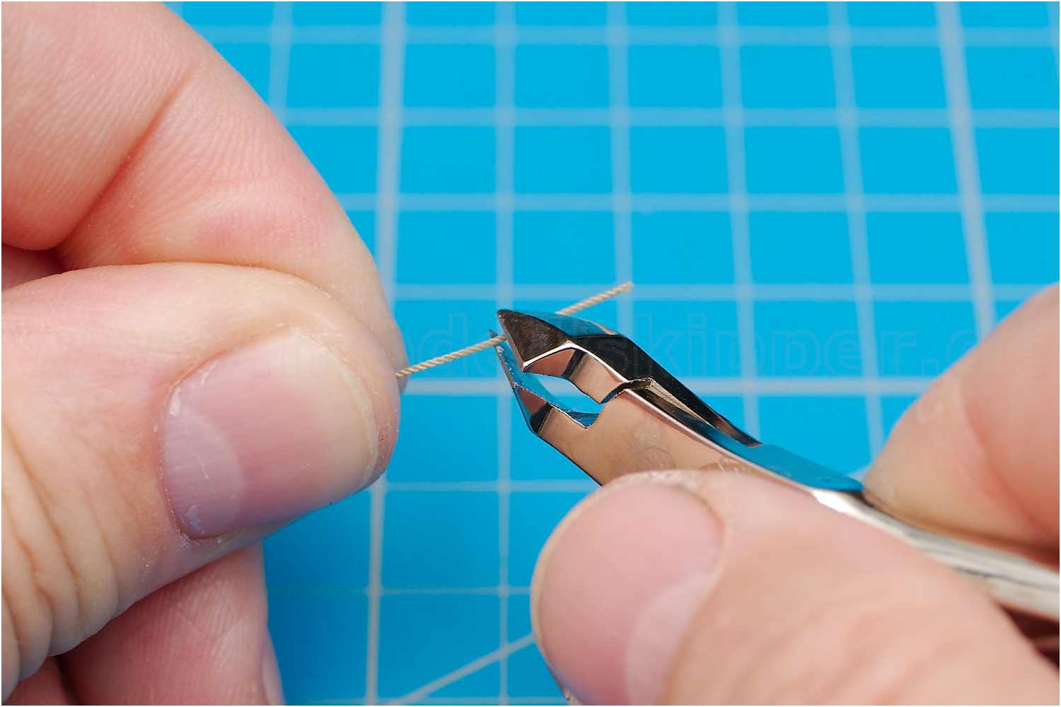 Anschließend tränkt man das Ende des Taus mit etwas dünnflüssigem Sekundenkleber, schneidet das ausgehärtete Endstück sauber ab und das Durchfädeln ist dann kein Problem mehr.