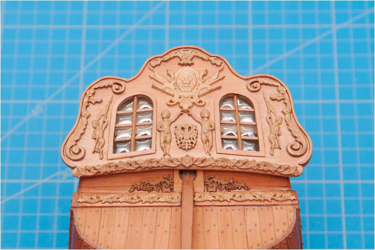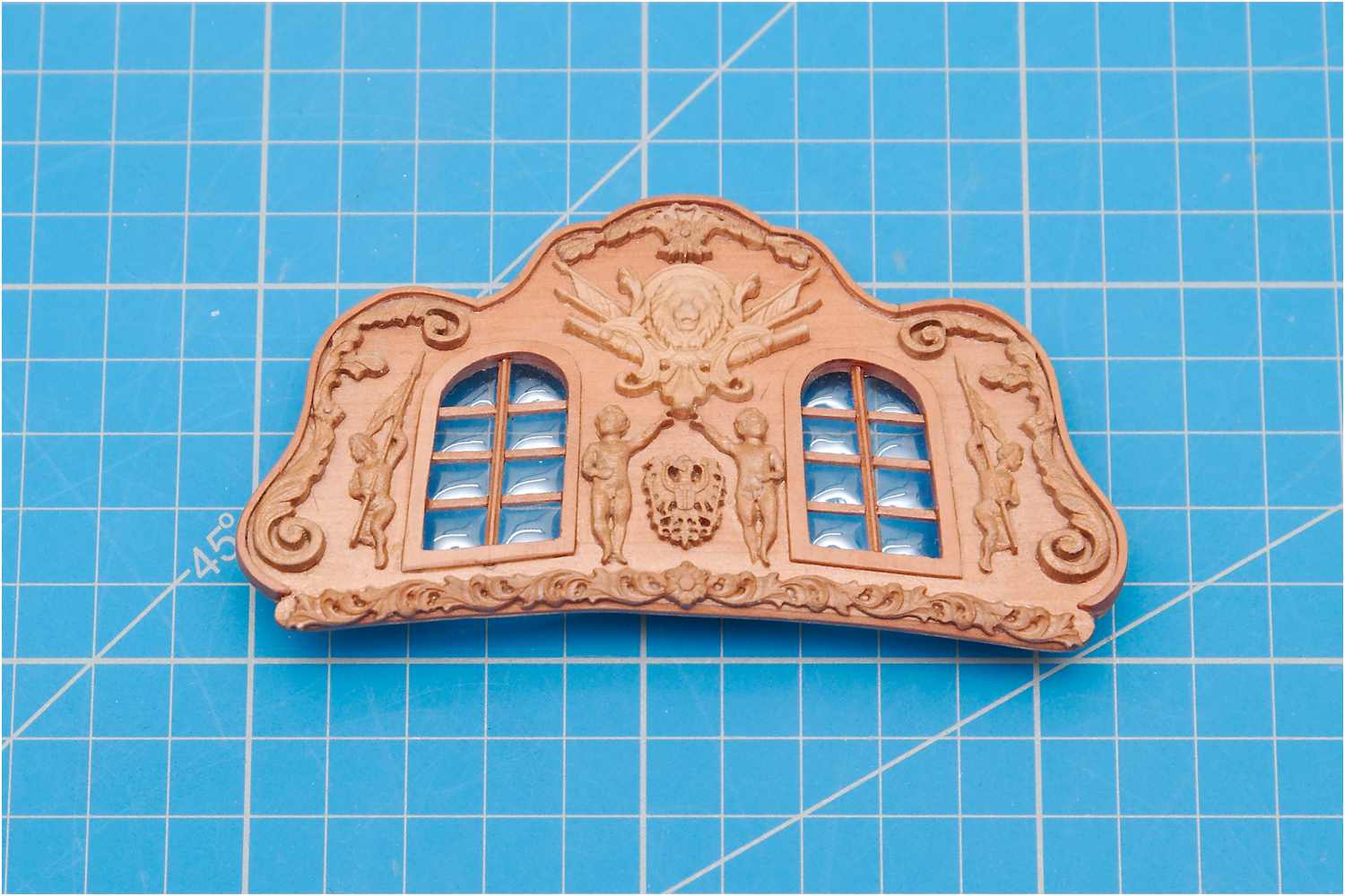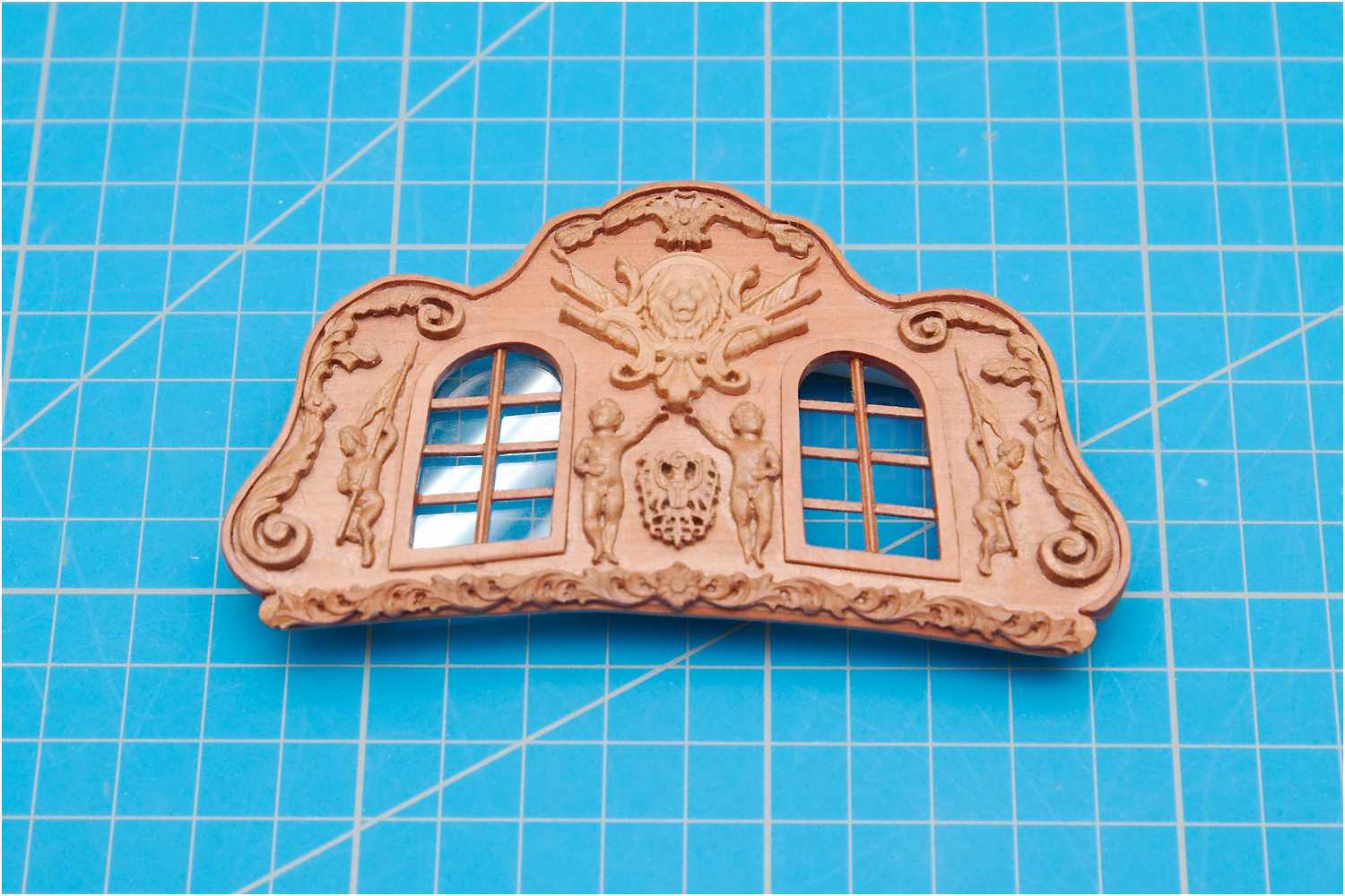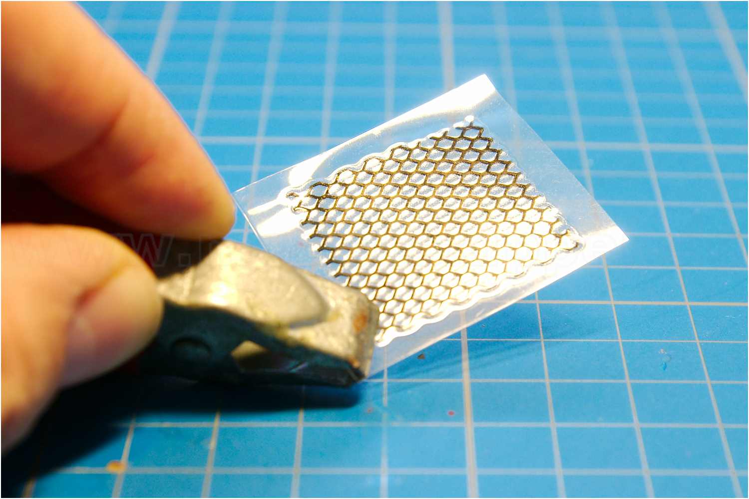 Hierzu wurde ein dünnes Messinggitter verwendet, zugeschnitten, brüniert und mit einem handelsüblichen Laminiergerät in Dokumentenfolie eingeschweißt.