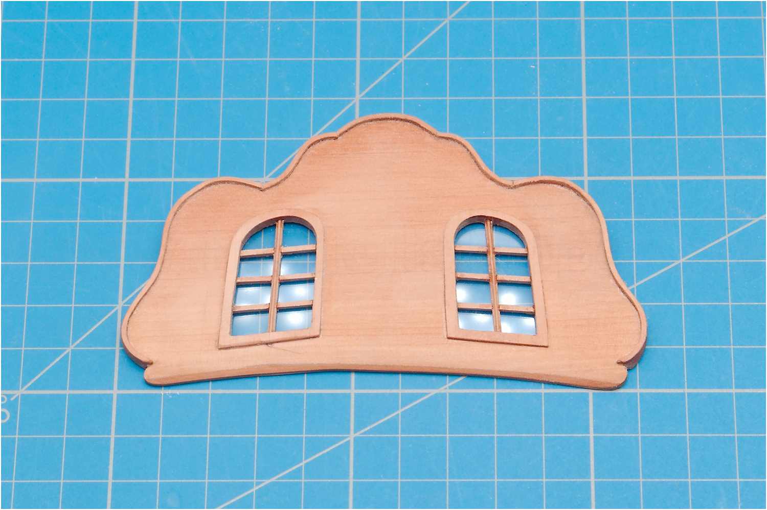 Für die 1. Variante, mit nach innen gewölbten Scheiben kam wieder Laminatfolie zum Einsatz, die in einer gefrästen Tasche hinter die Fenster geklebt und auf der Vorderseite mit Klarlack ausgegossen wurde.