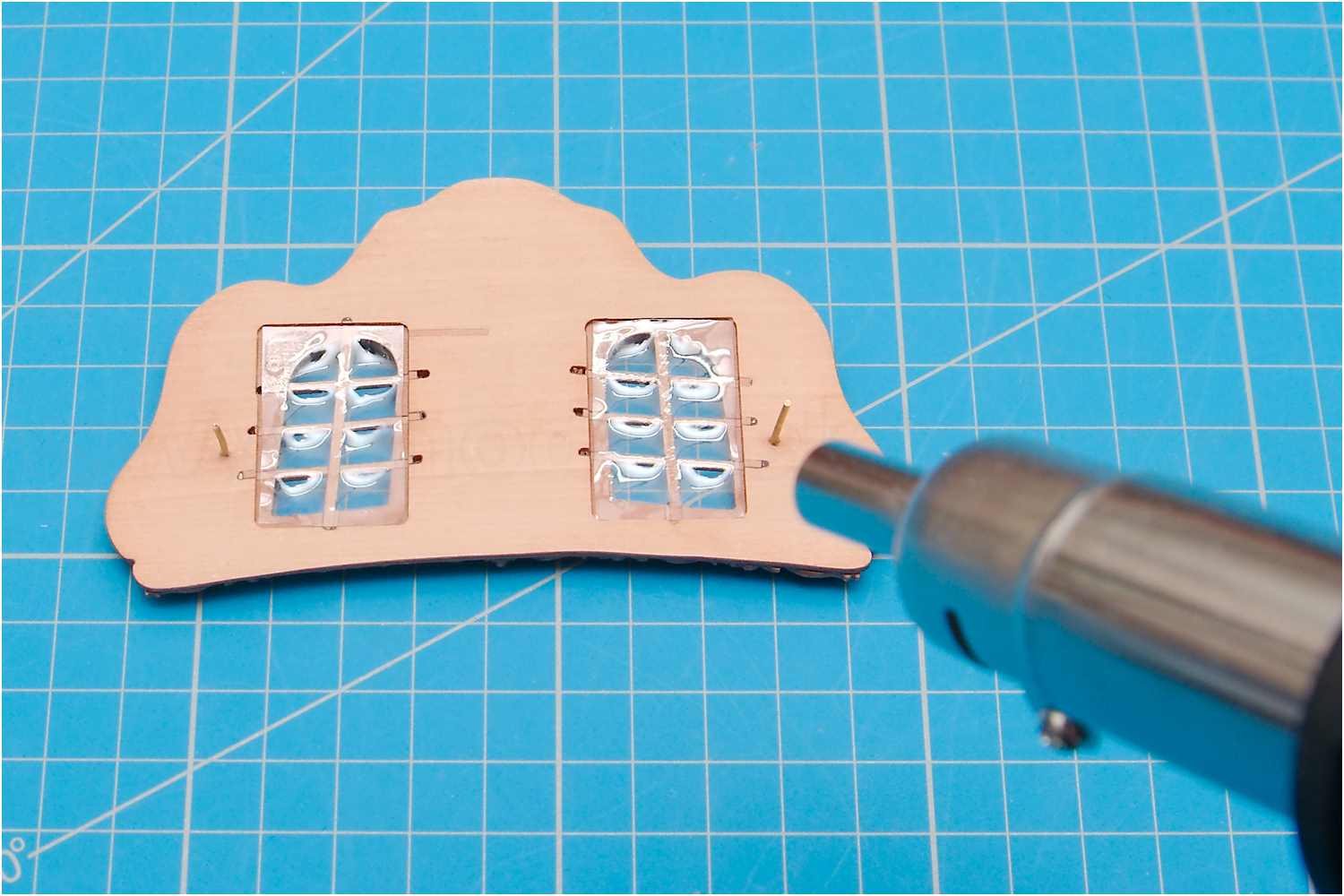 Einzelne Fenster können gleich auf die Folie geklebt und ohne Verrutschen ggf. mehrfach erwärmt werden, bis der gewünschte Effekt erreicht ist.