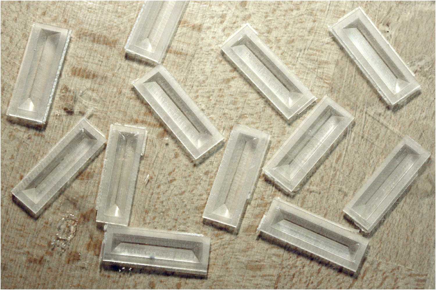 Jetzt werden die Prismen aus dem Acrylglas gelöst, indem man noch einmal mit einem dünnen Fräser in der Mitte der vorher ausgearbeiteten Nuten die Teile herausschneidet, so, das bei Bedarf ein kleiner Rand erhalten bleibt.