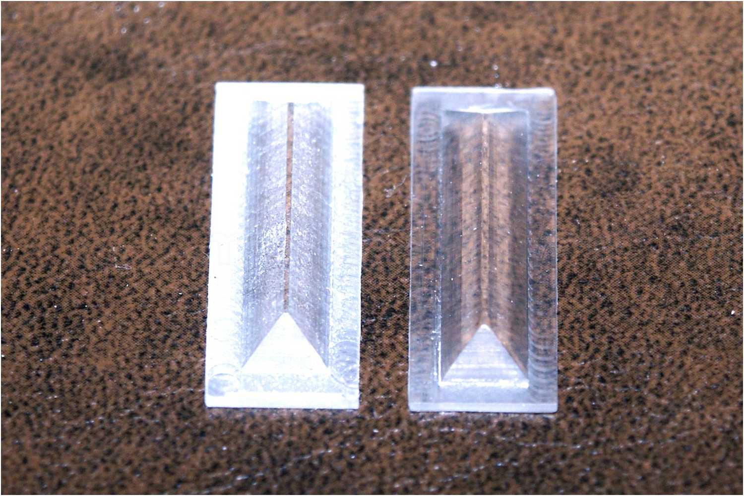 Anschließend an den Längs- und Stirnseiten der Rohlinge mit einem sog. Nutfräser, z.B. Dremel 640, mit einem 90°-Schnittwinkel jeweils eine Phase fräsen, die im Querschnitt die Form einer Pyramide haben.