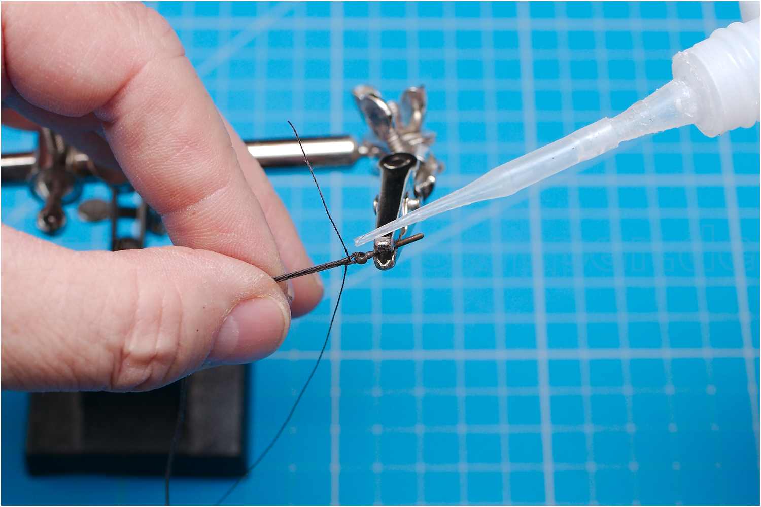 Diesen Knoten nun ebenfalls mit Sekundenkleber fixieren und die überstehenden Enden des Taus eng am Knoten abschneiden.