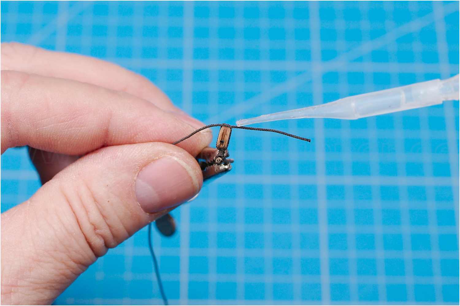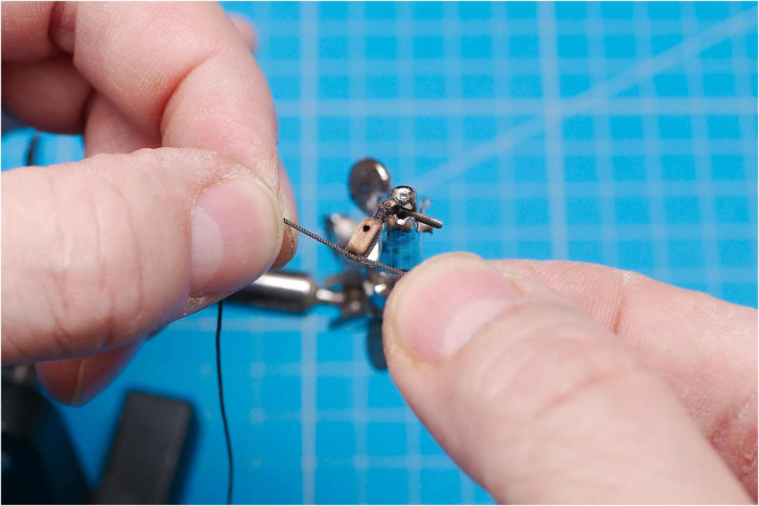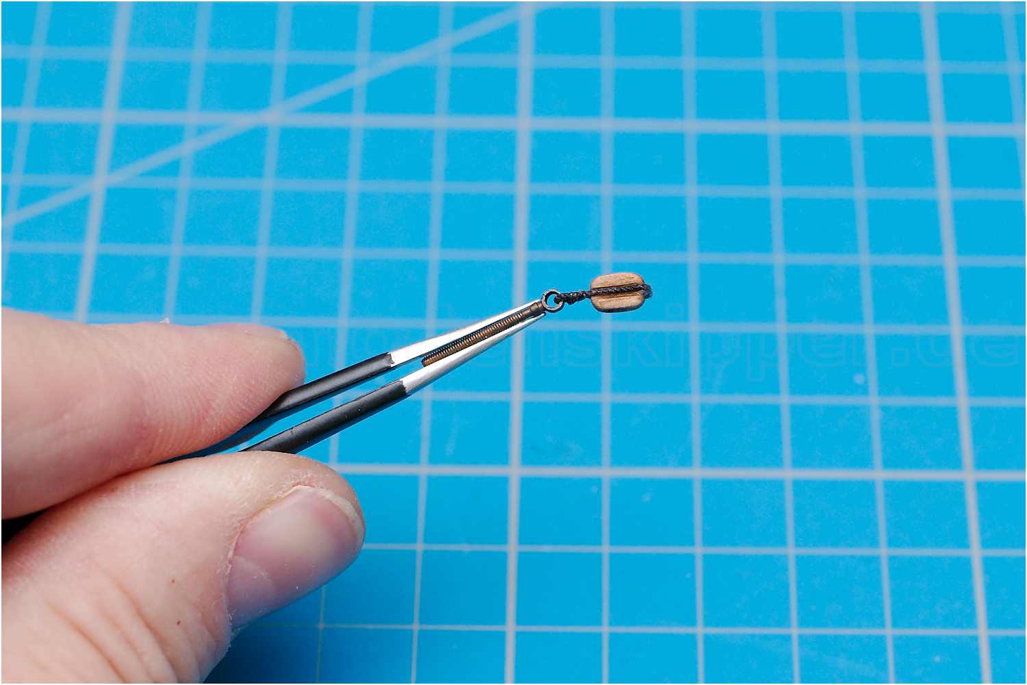 Der Augbolzen ist so in einer Schlaufe eingebunden, die vorsichtig mit einem Tropfen Sekundenkleber fixiert wird. Das kleine Auge sollte sich noch lose am Augbolzen bewegen lassen.