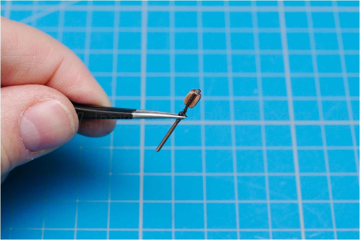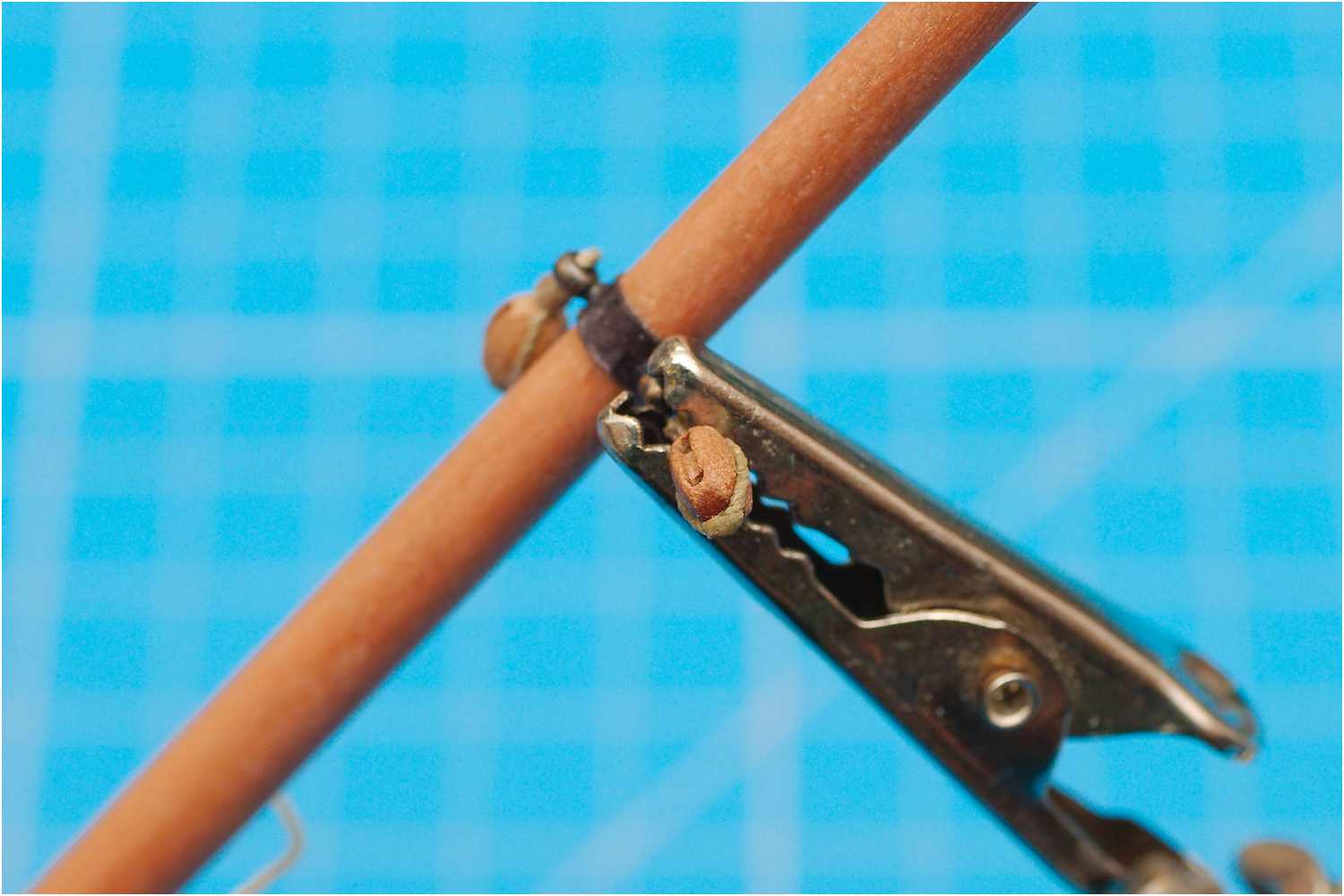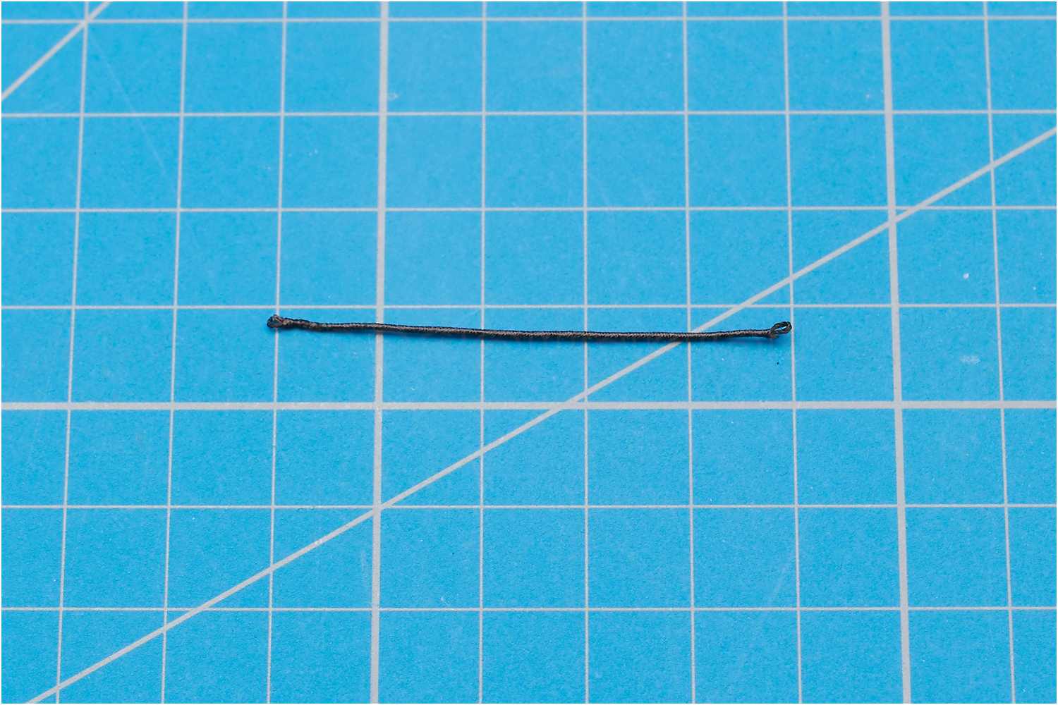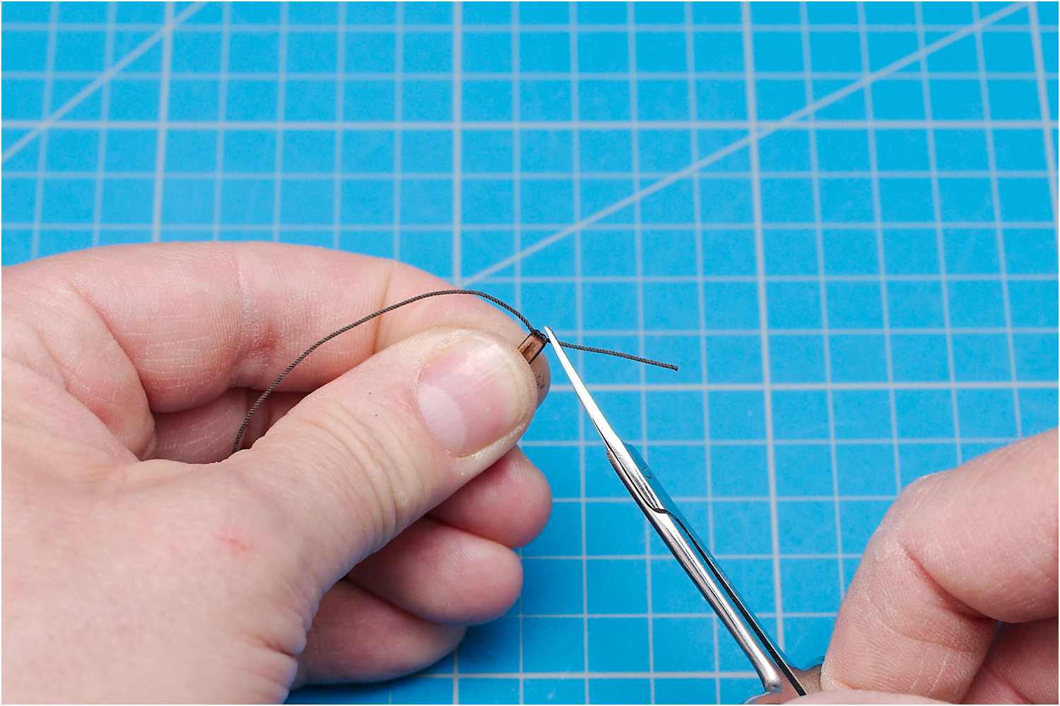 Der Augbolzen ist so in einer Schlaufe eingebunden, die vorsichtig mit einem Tropfen Sekundenkleber fixiert wird. Das kleine Auge sollte sich noch lose am Augbolzen bewegen lassen.