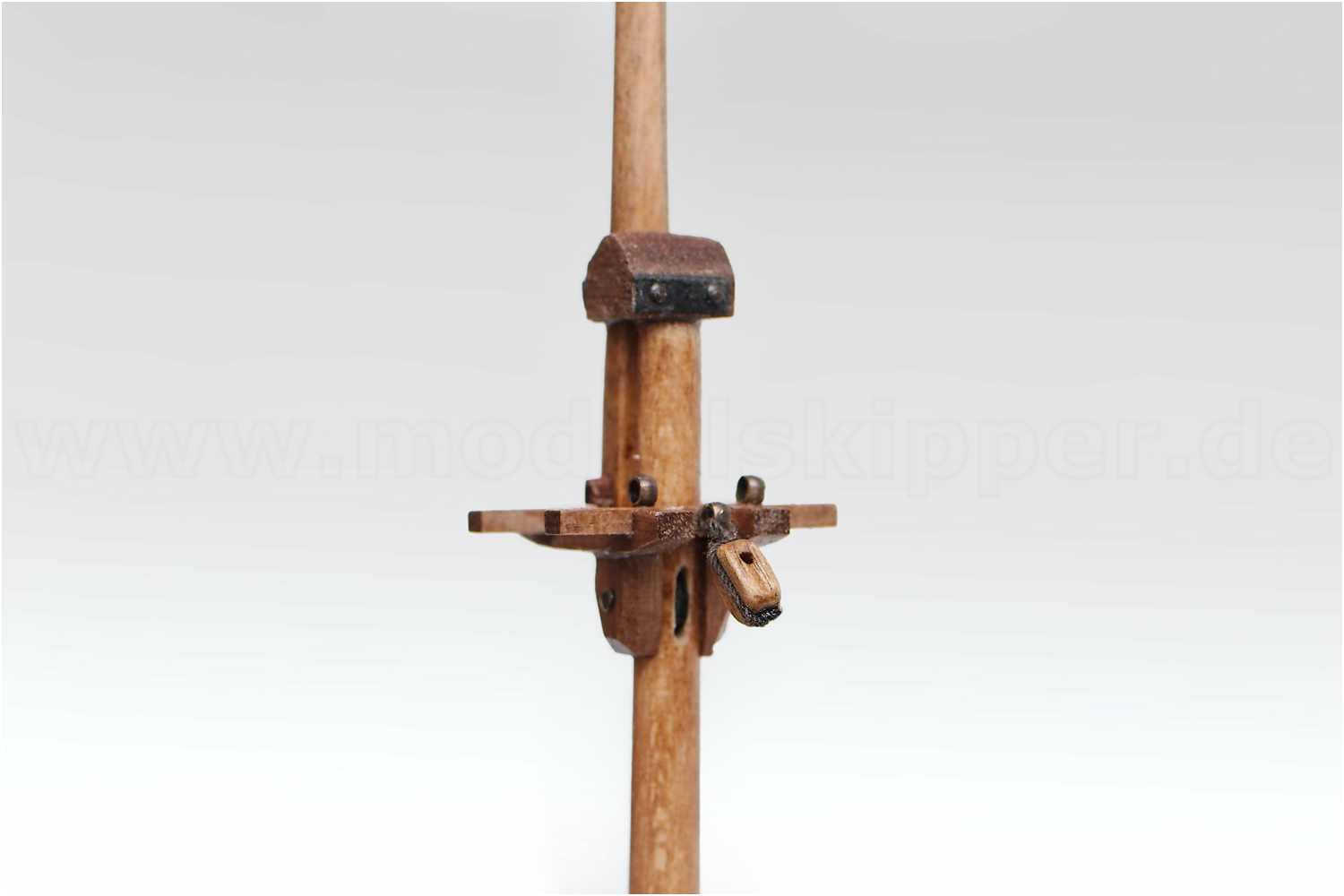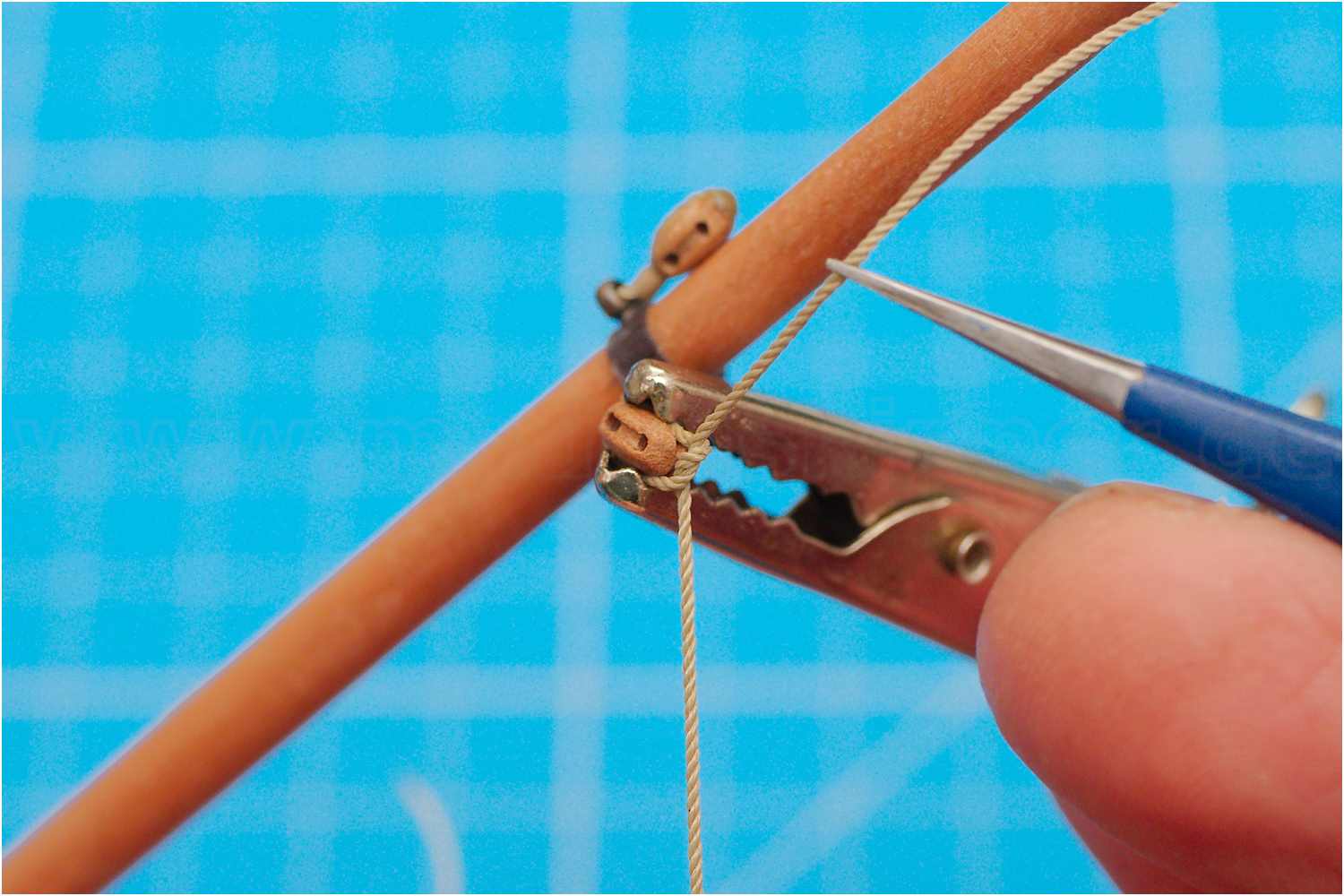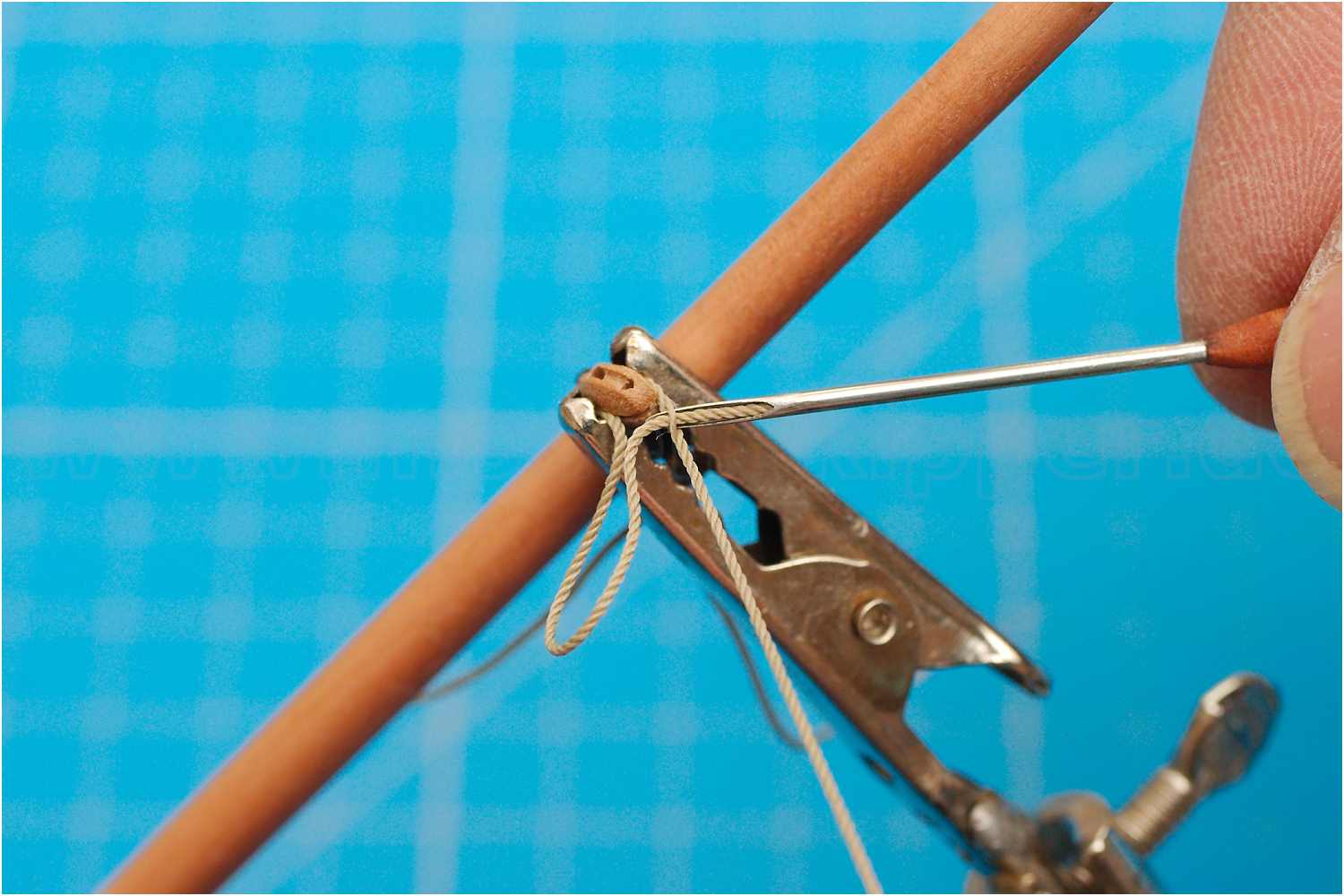 Den Stropp lege ich über den Bugspriet und verbinde die beiden Augen mit einem Faden.