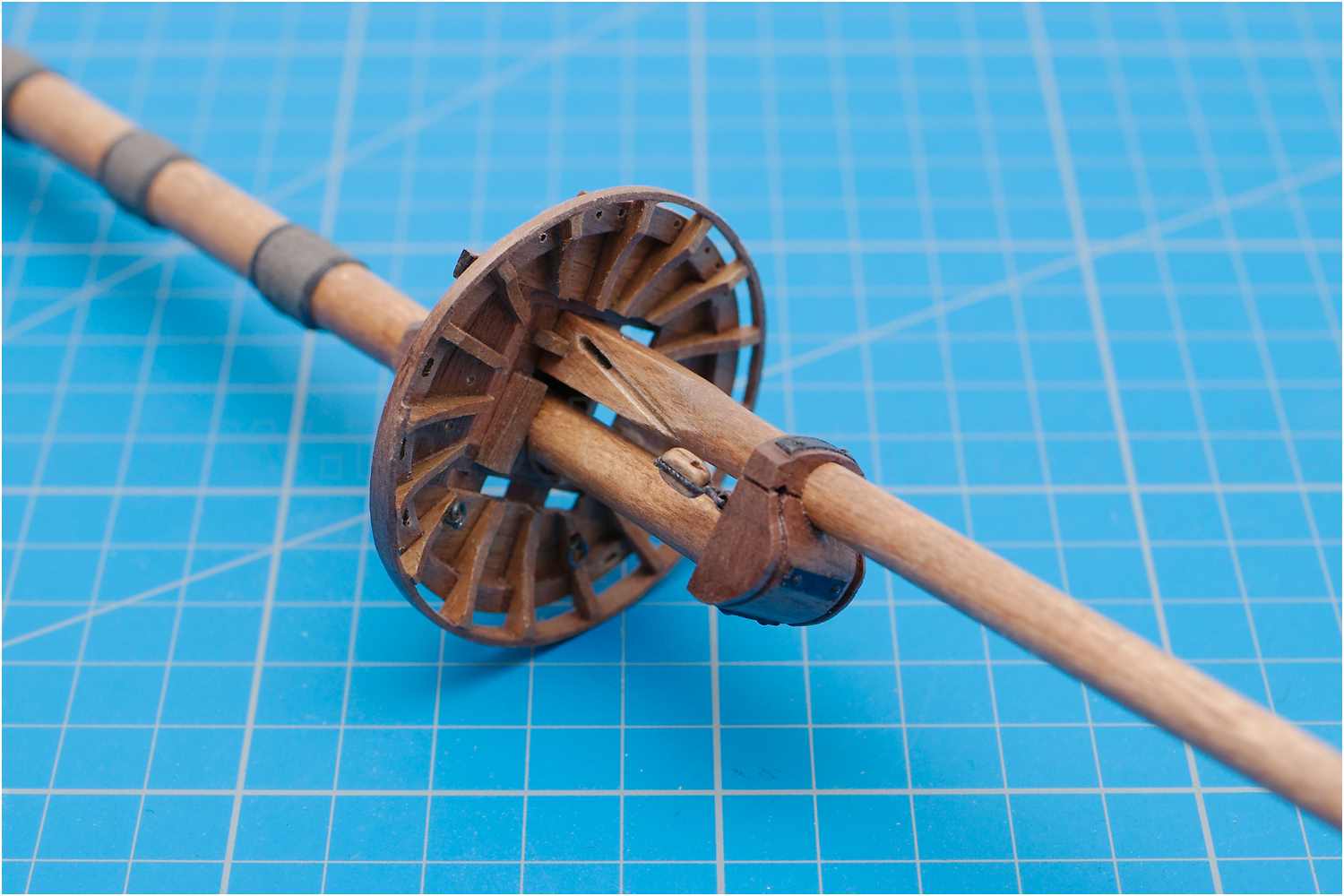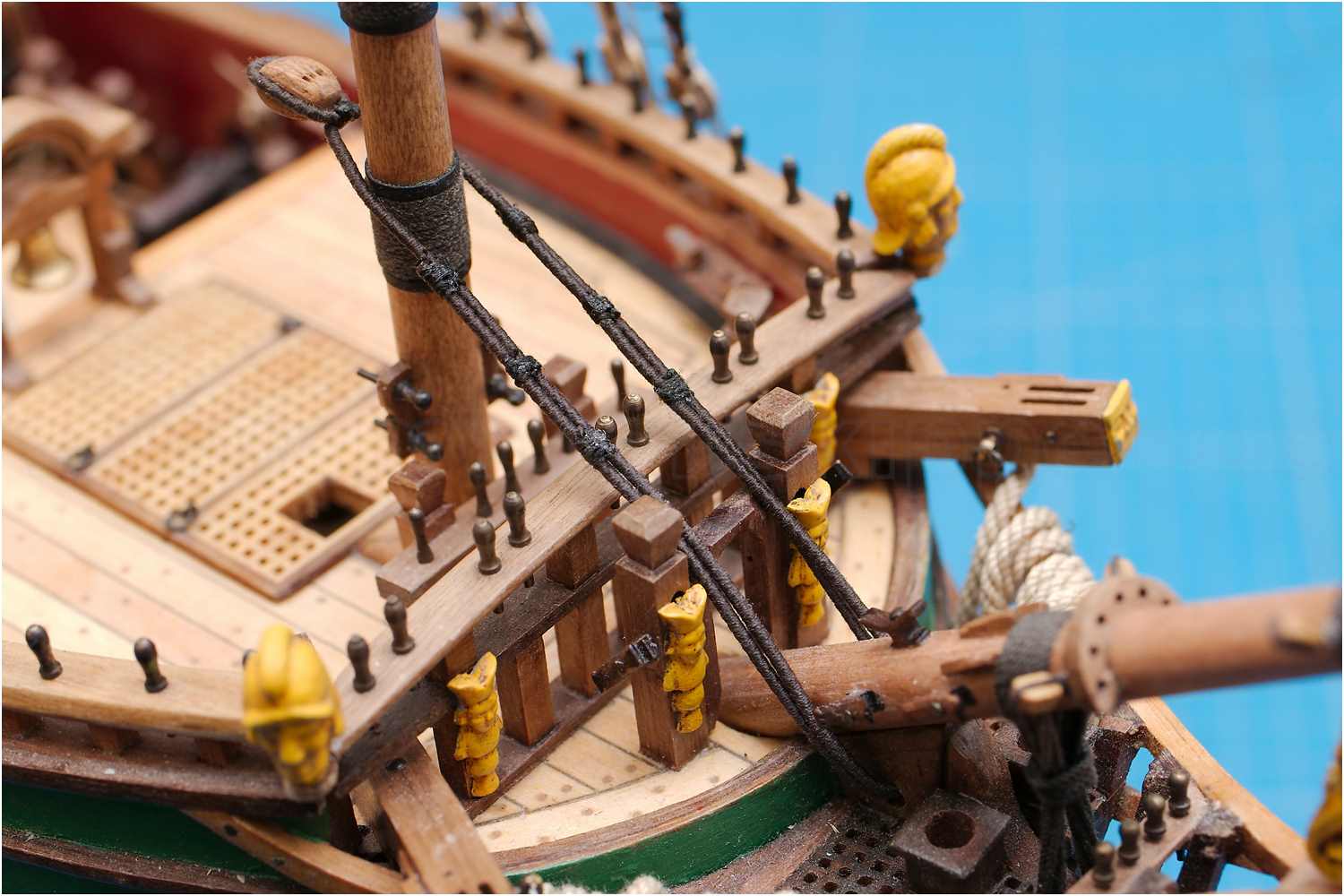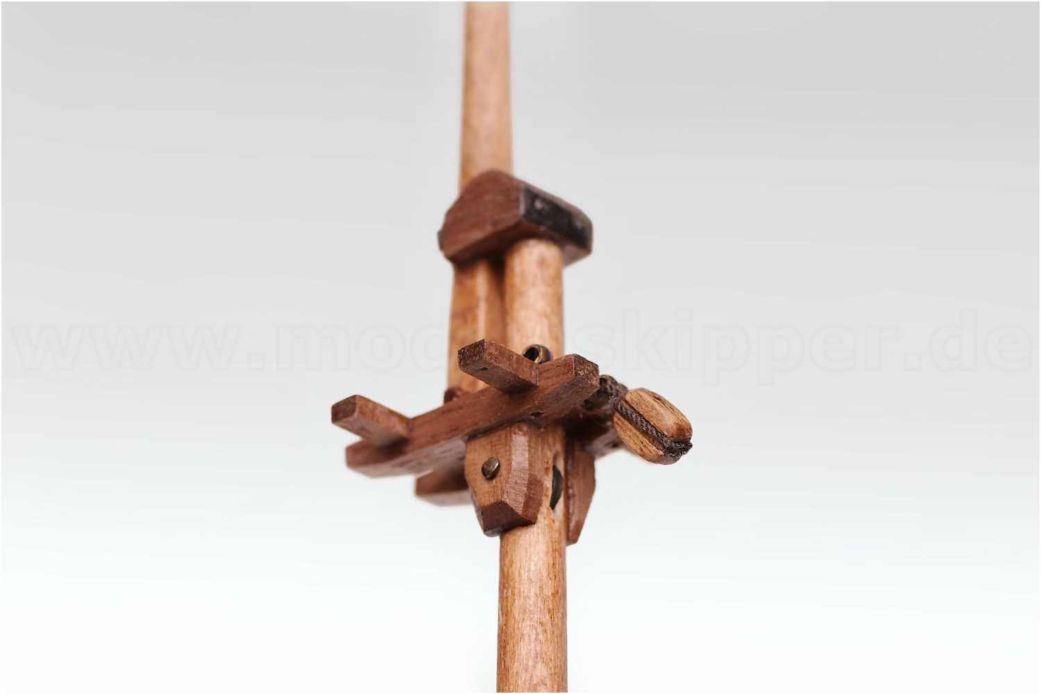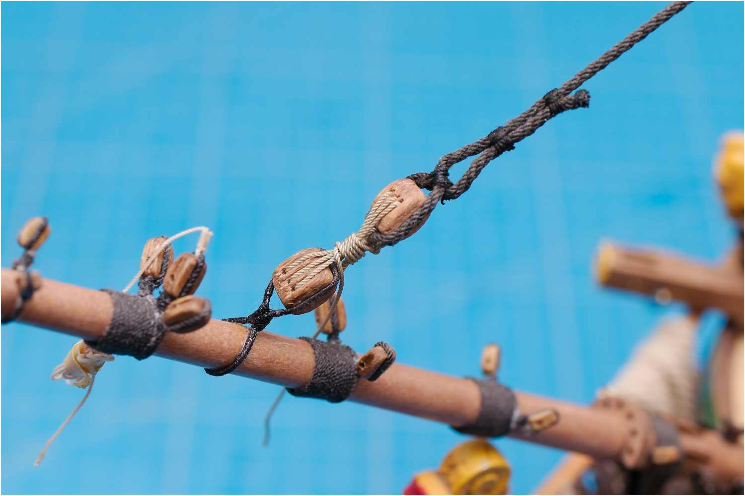 Den Stropp lege ich über den Bugspriet und verbinde die beiden Augen mit einem Faden.