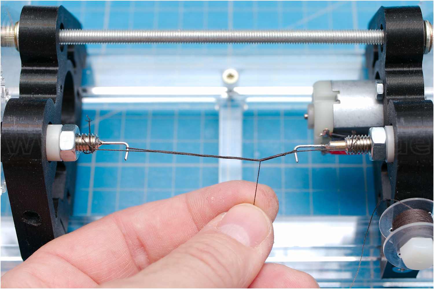 An der Kleedmaschine kann ich zwei Haken einsetzen, binde dort einen Faden so, dass ich auf jeder Seite ein kleines Auge erhalte, nicht viel größer als ein Nadelöhr.