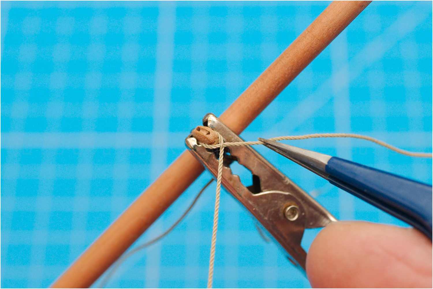 Ein Tau mit aufgefädeltem Augbolzen wird um die Nägel gelegt und beide Enden mit Klammern am Holz fixiert. Mit dünnem Garn wird nun auf das Stropptau aus vier bis fünf Törns ein Takling gesetzt. Unbedingt darauf achten, dass der Faden für den Takling viel dünner sein muss als das Stropptau selbst, ein Drittel ist ein guter Wert.