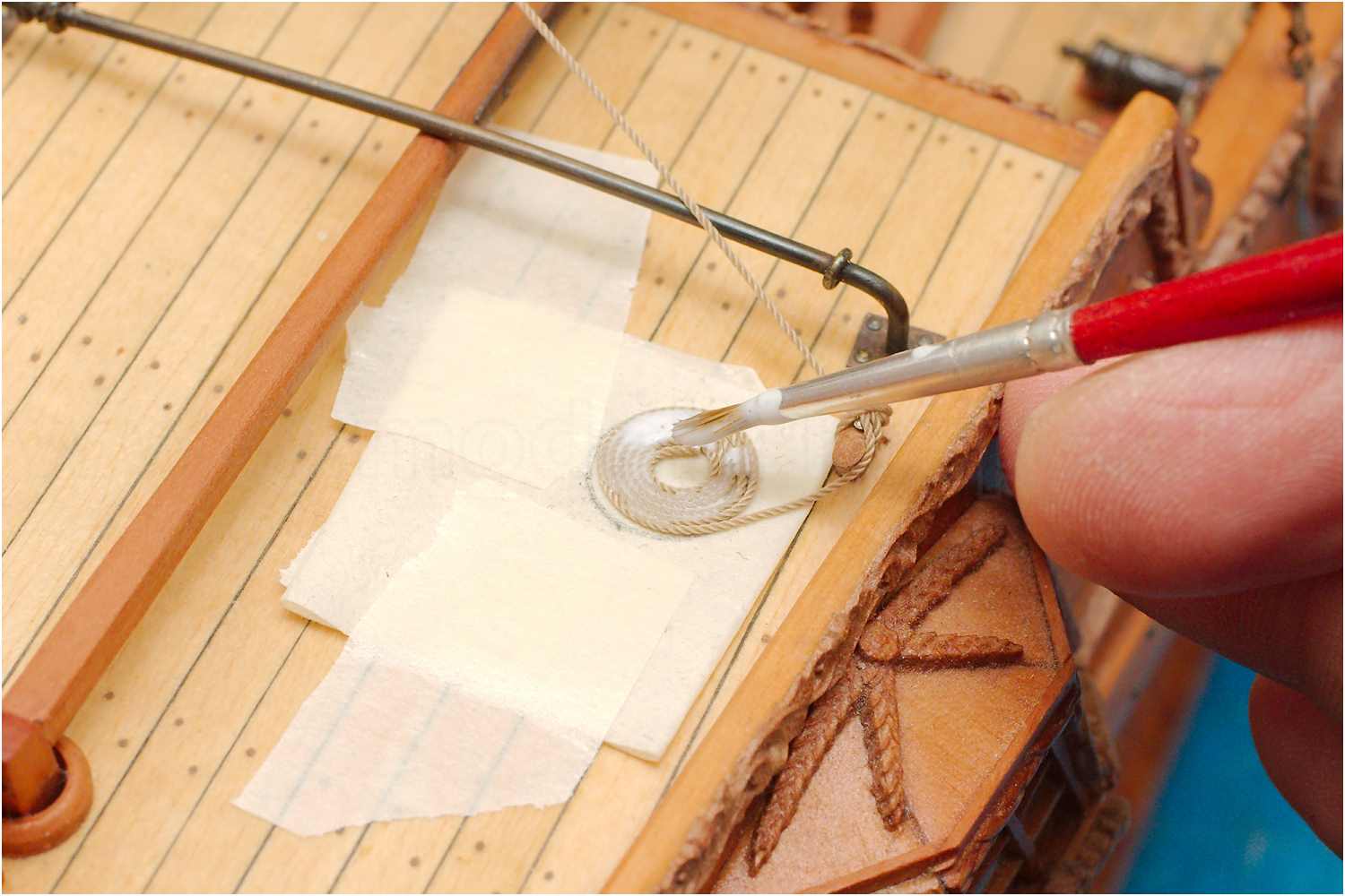 Dazu faltet man ein Stück Malerkrepp, sodass es einerseits auf dem Deck klebt und andererseits, das Tau beim Legen der Spirale fixiert wird.