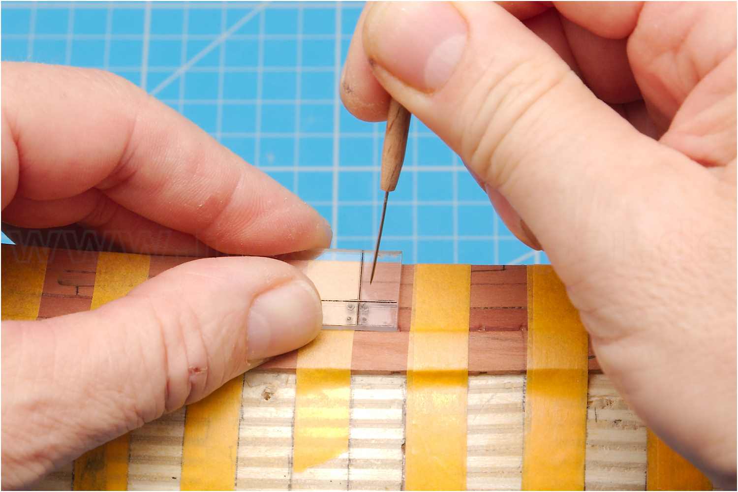 Auch die Abnahme einer dreidimensionalen Kontur wie den spitzen Plankenverlauf von Leisten, wie hier beim sog. Sandgang an der Rundung des Bugs beim Übergang vom Kiel zum Vorderstevens.
