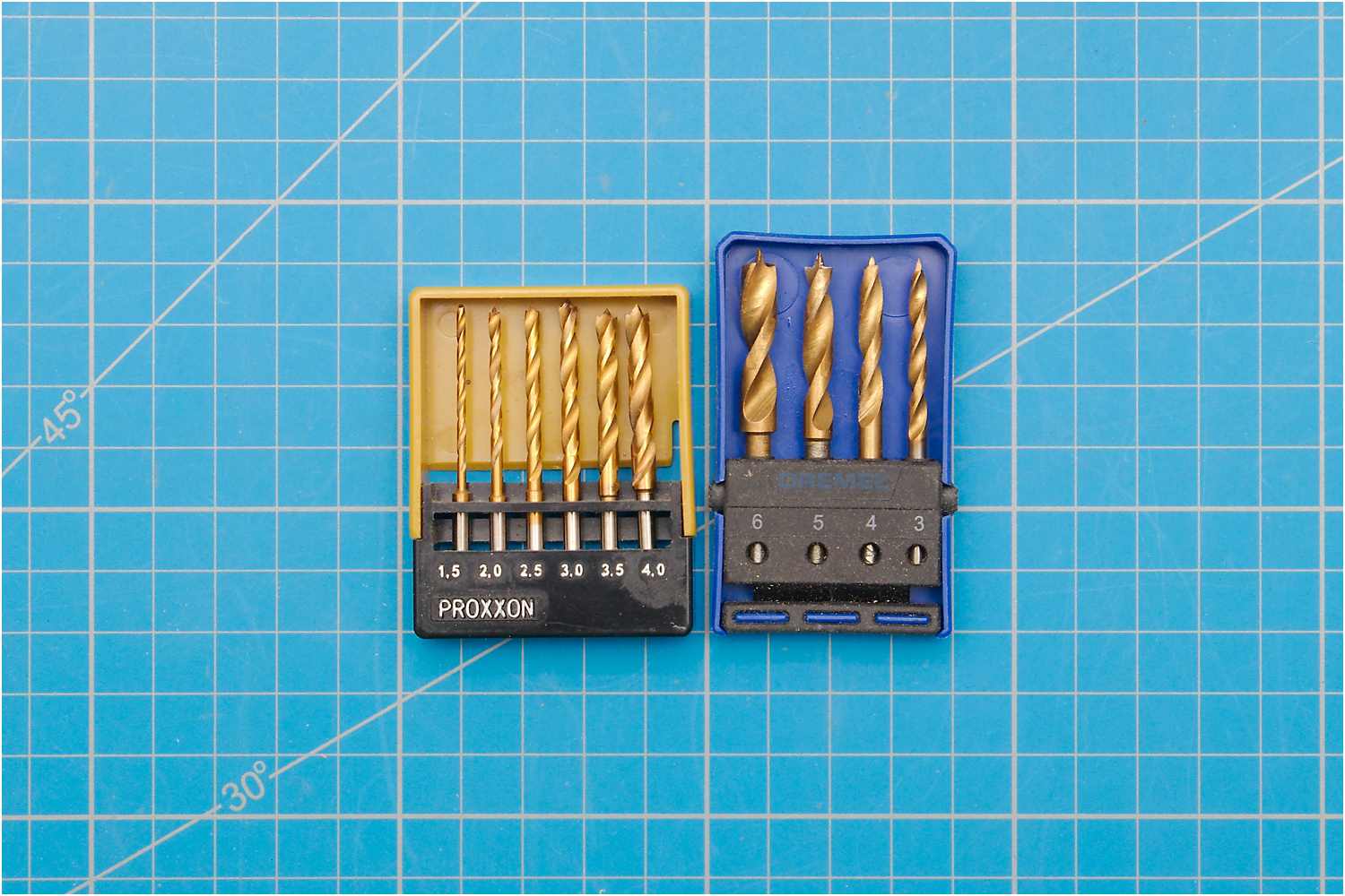 Jeweils ein Satz von Proxxon und Dremel passen gut in die Microfräse oder in die Handbohrmaschine.